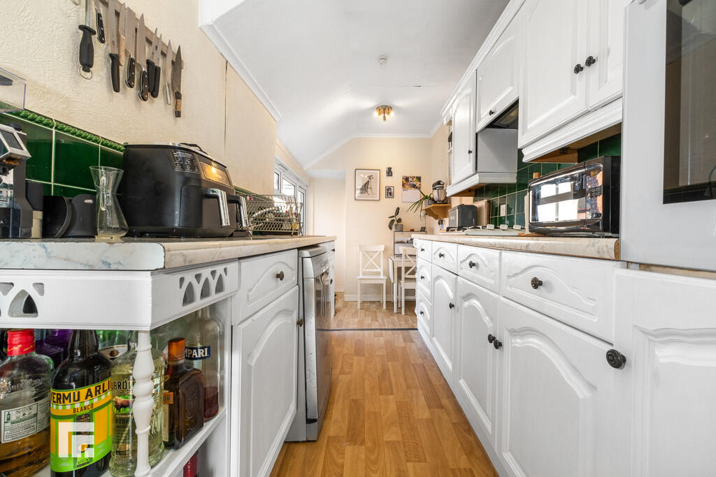 KITCHEN18' 10" x 6' 5" (5.76m x 1.98m) Laminate flooring. Range of wall, base and drawer units with worktops over incorporating 1.5 stainless steel sink and drainer with hot and cold tap over, and four ring gas hob with extractor above. Integrated oven. Partially tiled walls and tiled splashback. Pendant light fitting. Space for appliances such as dishwasher and fridge/freezer. Double glazed window to side aspect. Radiator. Power points. Double glazed door leading to rear garden. Opening into utility room.