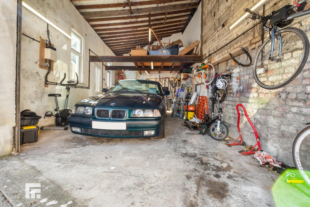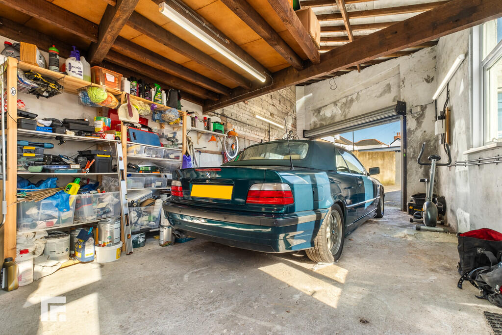 Roller shutter door. Space for two cars. Window onto rear garden. Mezzanine floor perfect for storage.