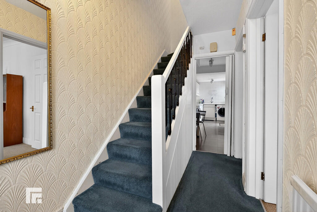 HALLWAY Entered via wooden door with obscure glazed panels. Further obscure glaized panels to either side. Low level cupboard housing gas meter. Wired for two wall lights. Stairs rising to first floor.