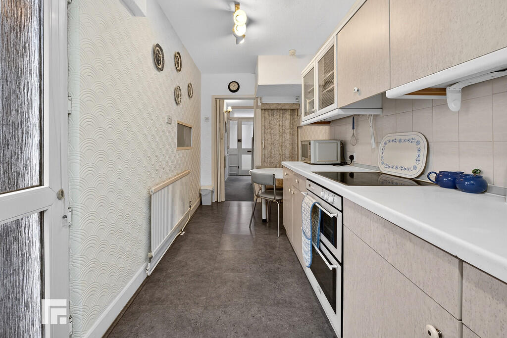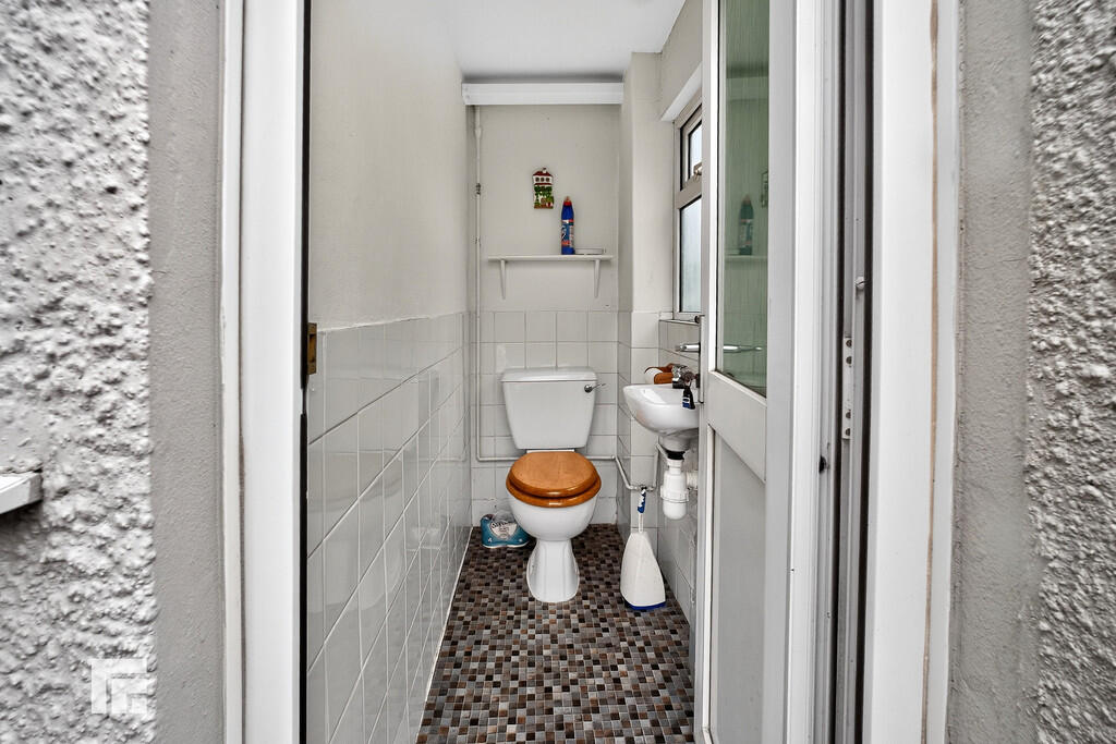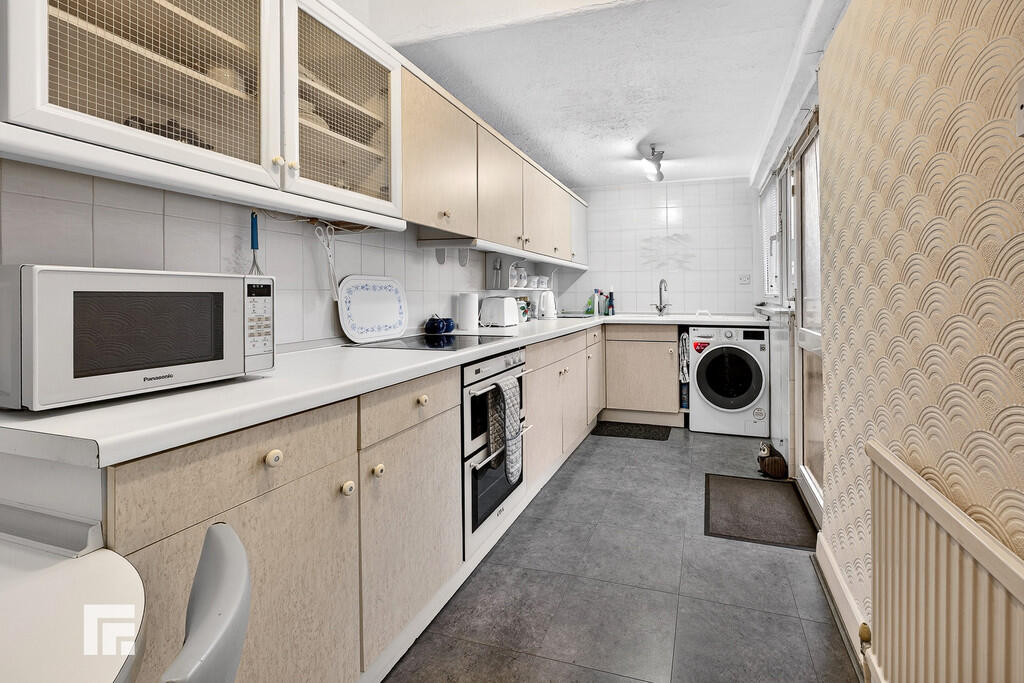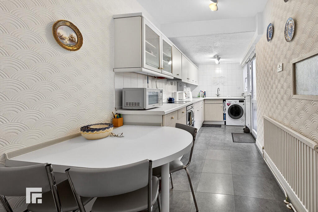 KITCHEN17' 9" x 6' 1" (5.43m x 1.86m) Upvc double glazed window to side. Upvc double glazed door with obscure glazed panels to side and rear garden. Tiled flooring and part tiled walls. Range of base and wall units with worksurface and tiled splash backs incorporating one and a half ceramic sink with mixer tap. Integrated fridge freezer. Built in electric oven with inset electric hob and extractor fan over. Plumbing for automatic washing machine. Built in dining/breakfast table. Understairs storage. Radiator.