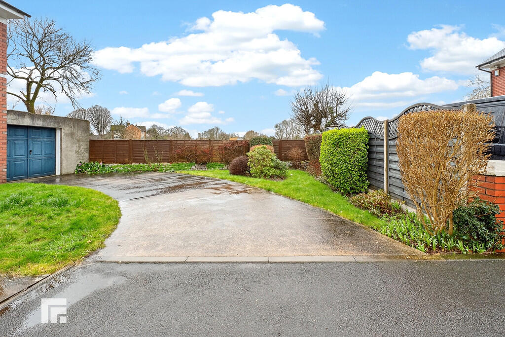 OUTSIDE REAR GARDEN - Enclosed and South facing rear garden. Crazy paved patio area. Laid to lawn with mature shrubs and flower borders. Green House. Door to garage.