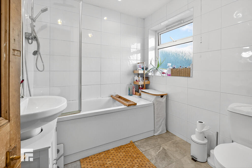 BATHROOM6' 10" x 6' 7" (2.09m x 2.02m) White three-piece-suite comprising WC, pedestal wash hand basin with mixer tap over and storage beneath, panelled bath with mains powered rainfall shower above and separate shower head fixture. Pendant light fitting. Obscure double glazed uPVC window. Tiled flooring and walls. Heated towel rail.