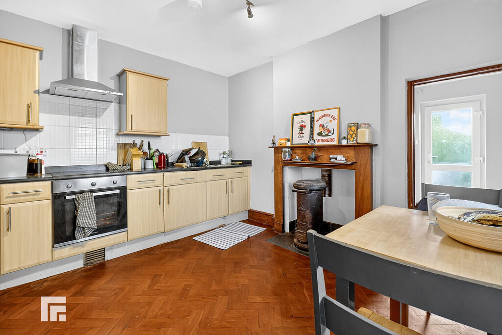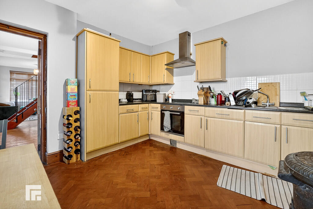 KITCHEN12' 0" x 10' 1" (3.67m x 3.09m) Double glazed uPVC window. Fitted kitchen with a range of wall, base and drawer units with worktops over incorporating 1.5 stainless sink and drainer with mixer tap over, four ring electric hob with extractor hood over. Integrated fridge/freezer. Partially tiled walls and parquet flooring. Pendant light fitting. Radiator. Doors leading to utility room and lounge.