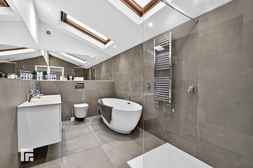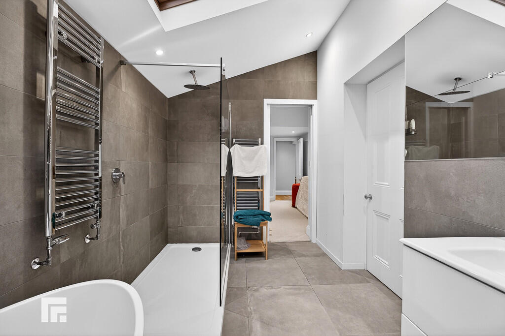 ENSUITE Tiled flooring and walls. Spotlights. Oval free standing bath with mixer tap over. Walk in shower cubicle with mains powered drench shower over. WC. Vanity 'his and hers' sinks with mixer taps over and storage beneath. Shaver point. Extractor. Two chrome heated towel rails. Velux window.