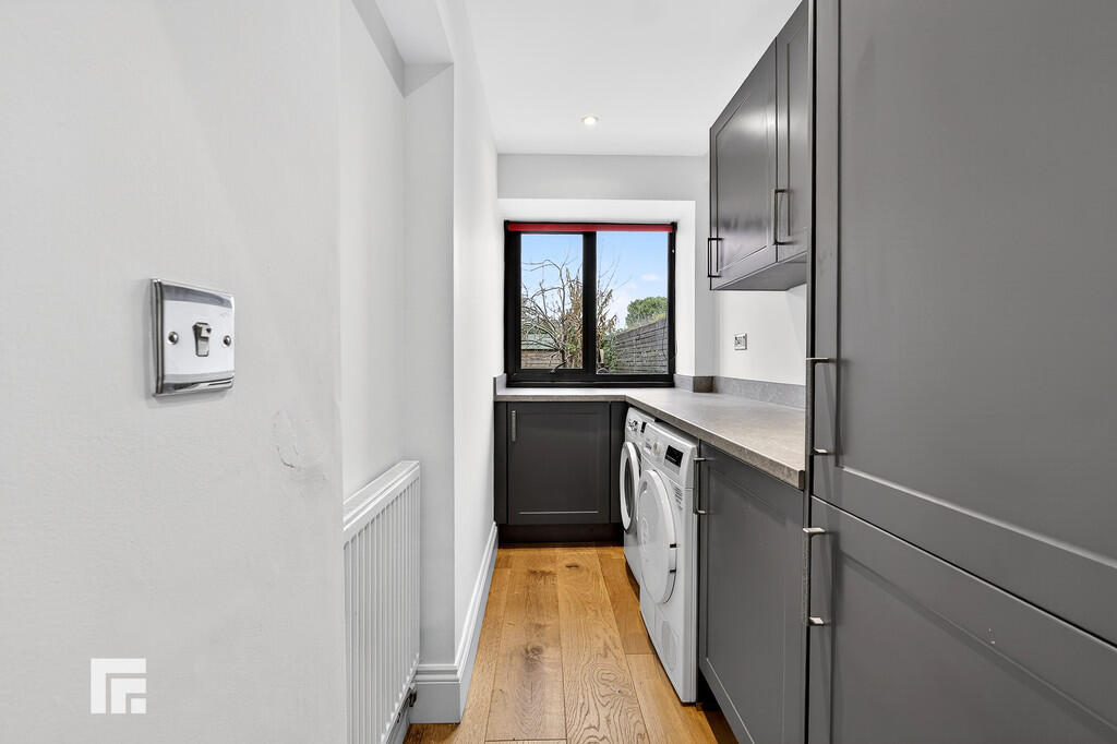 UTILITYROOM11' 5" x 4' 11" (3.49m x 1.51m) Continuation of wood flooring. Wall and base units with worktops over. Space and plumbing for washing machine and tumble dryer. Spotlights. Double glazed uPVC window to rear aspect. Power points. Radiator.
