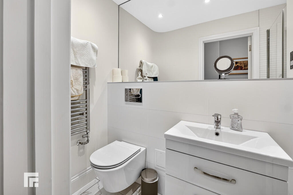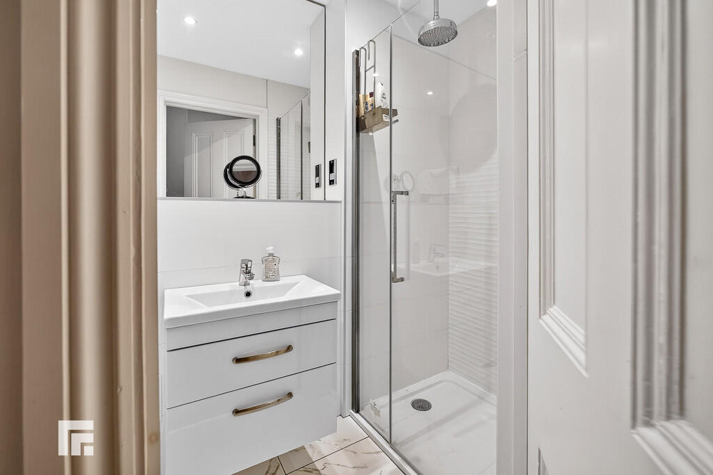 SHOWERROOM Tiled flooring and walls. Vanity wash hand basin with mixer tap over and storage beneath. WC. Walk in shower cubicle with mains powered shower over. Spotlights. Extractor. Chrome heated towel rail.