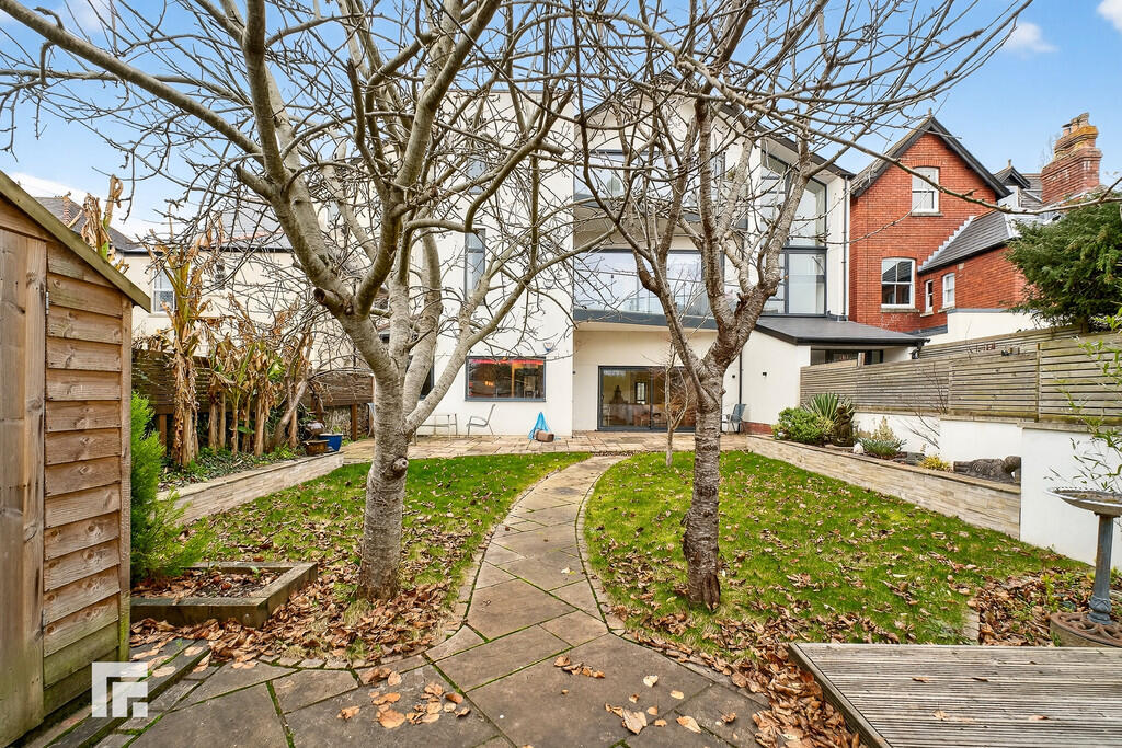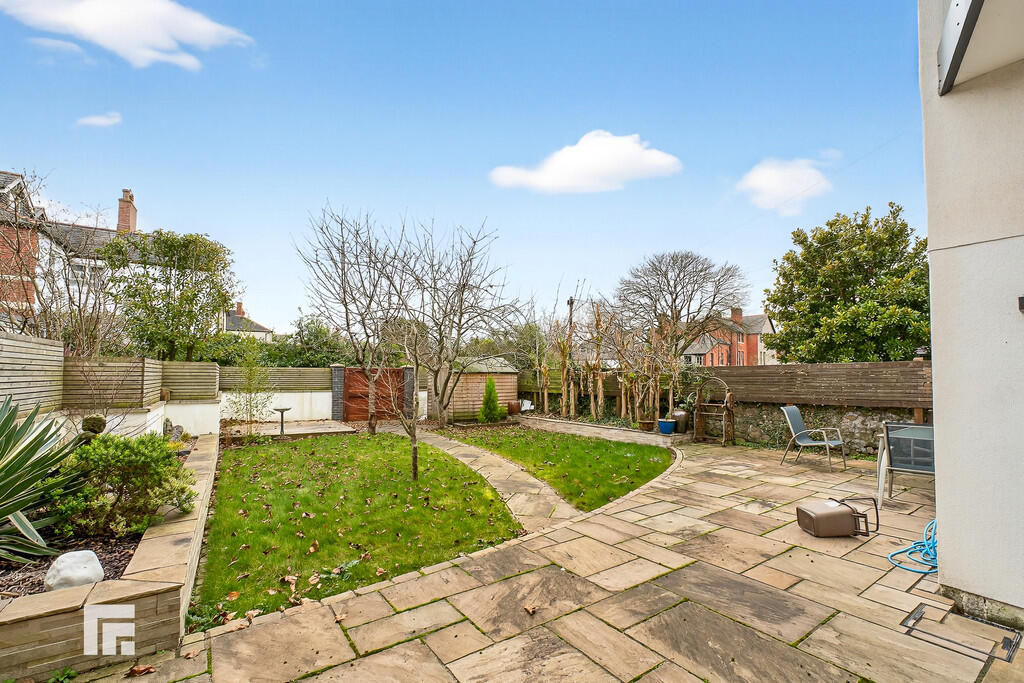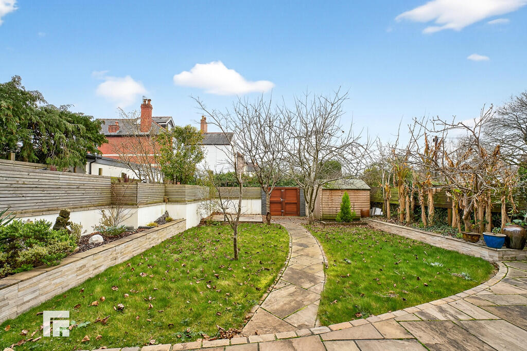 Rear - Laid to patio. Lawn area. Fence border. Gate leading to rear lane. Outside tap. Mature flower bed borders. Mature trees. Decked area to far end.