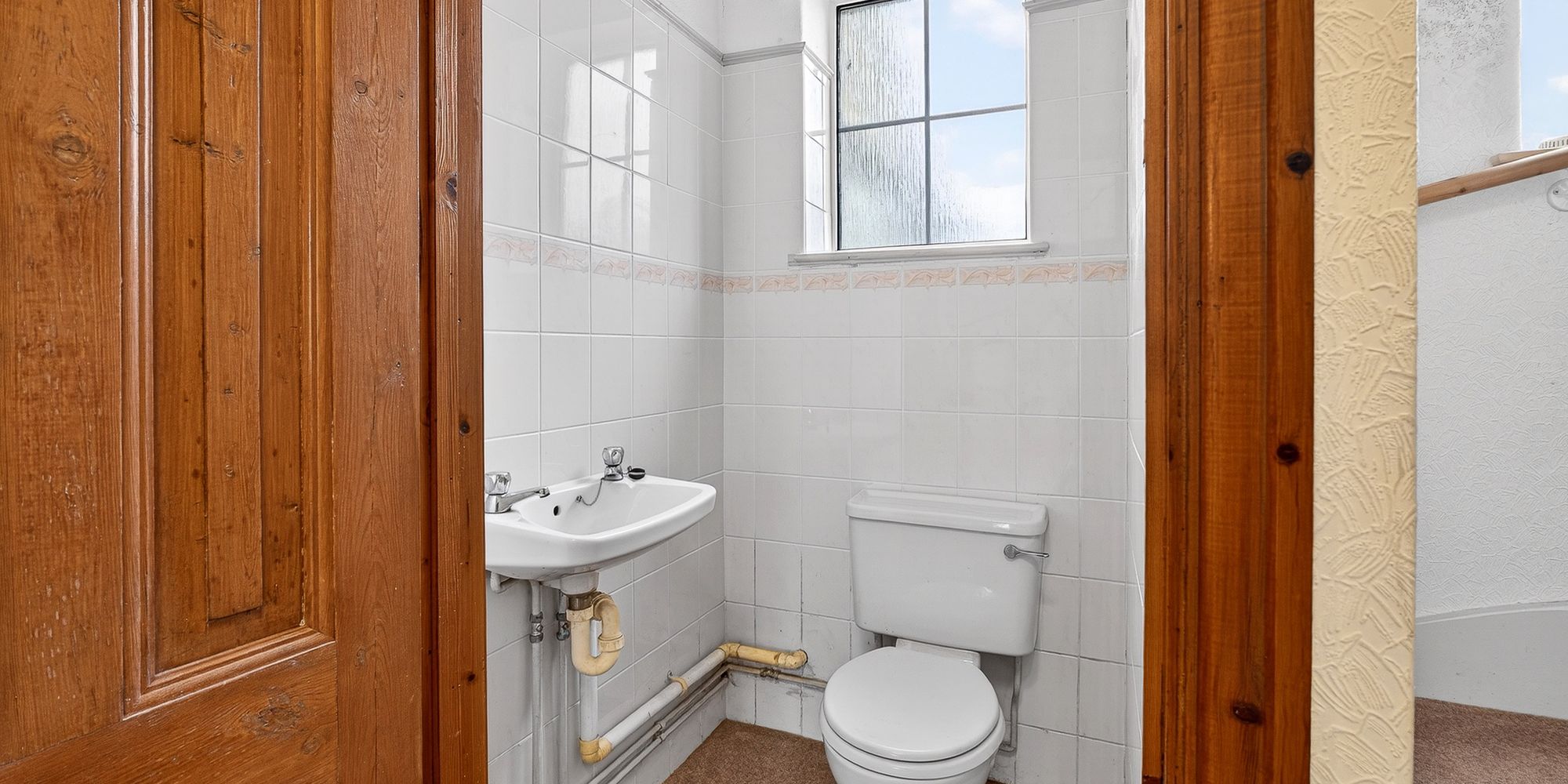 WC Obscured double glazed window to rear. W.c, wall hung wash hand basin with hot and cold taps. Mostly tiled walls.