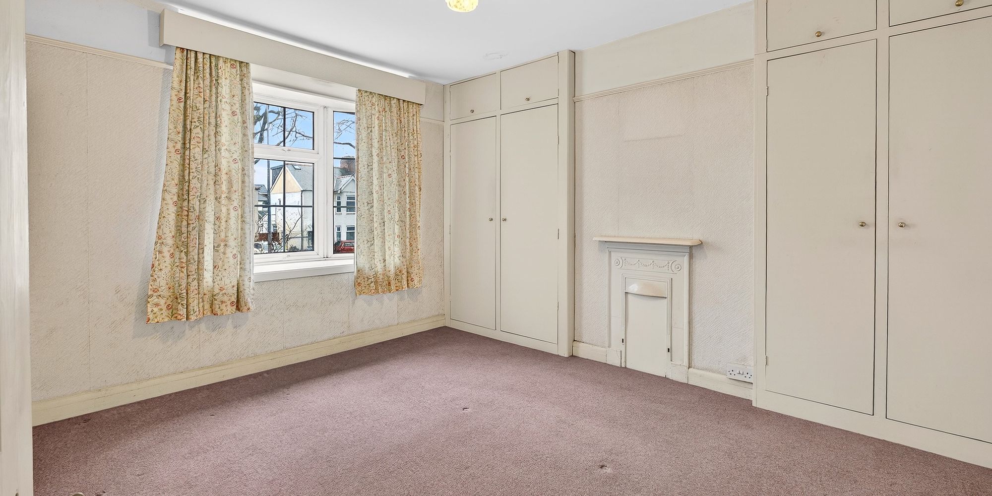 BEDROOM ONE Dimensions: 14' 7" into bay x 11' 9" max to back of fitted wardrobe(4.45m x 3.60m). Double glazed bay window to front. Feature fire surround. Picture rail.