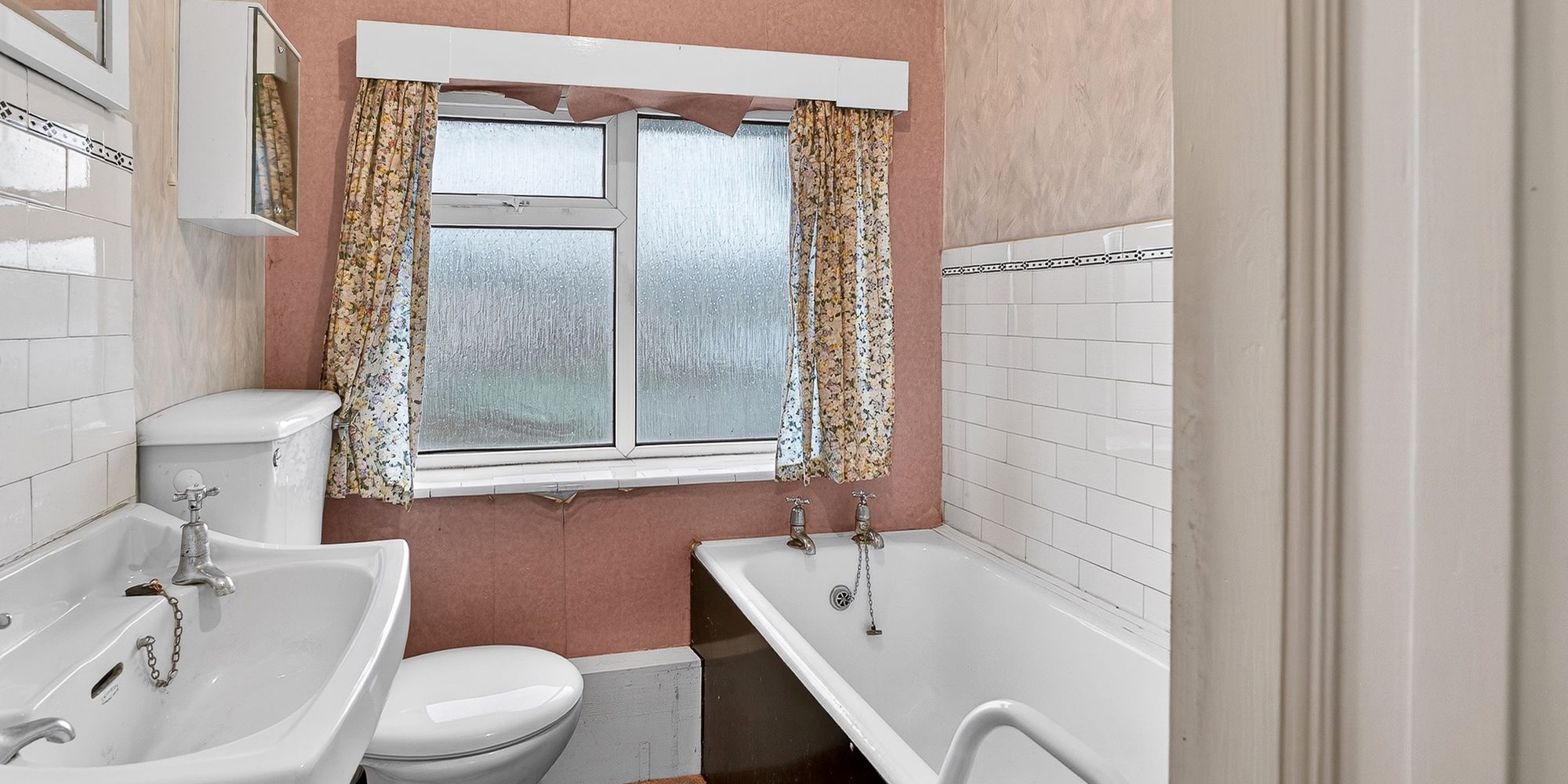 BATHROOM Dimensions: 7' 0" x 5' 9" (2.15m x 1.76m). Obscured double glazed window to rear. Cupboard housing hot water tank. Bath with hot and cold taps, w.c, wall hung was hand basin with hot and cold taps.