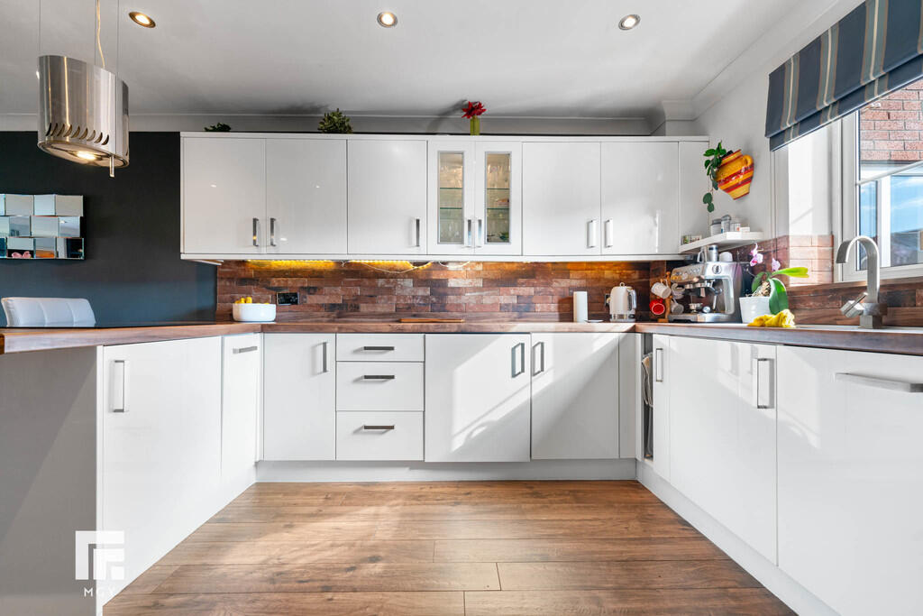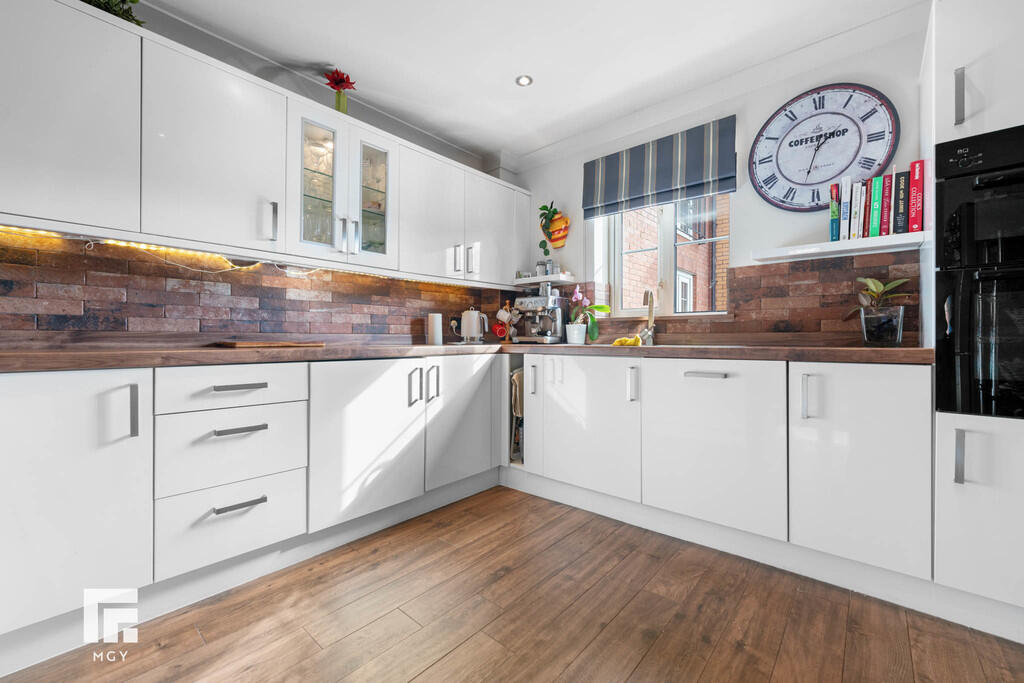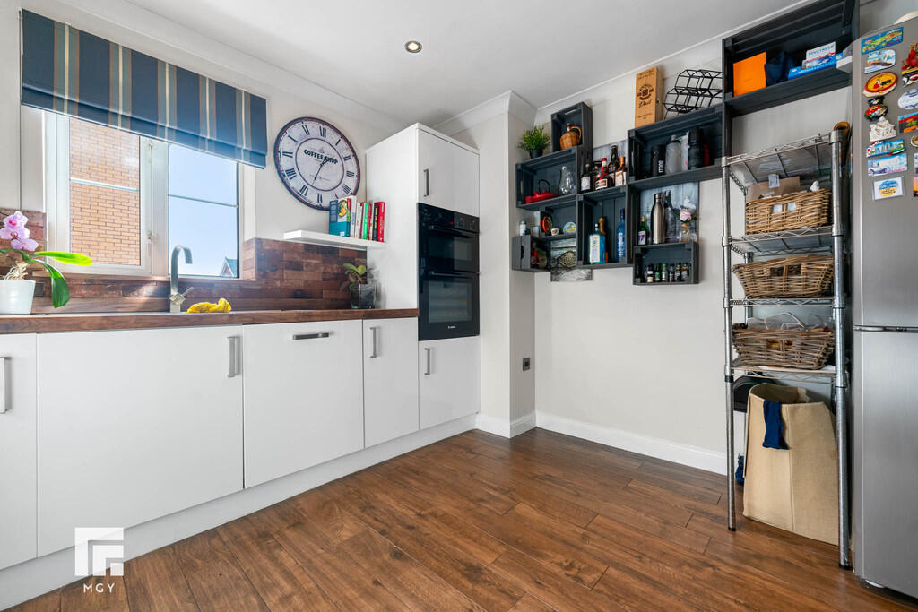 KITCHEN13' 4" x 11' 2" (4.08m x 3.41m) Porcelain tiled flooring with underfloor heating. Modern fitted kitchen with a range of wall, base and drawer units with worktops over incorporating inset sink with mixer tap over and electric hob with extractor above. Tiled splashback. Integrated appliances such as dishwasher, washing machine, oven and grill. Space for fridge/freezer. Spotlights. Under counter lighting. Breakfast bar with stool seating. Double glazed window to rear aspect.