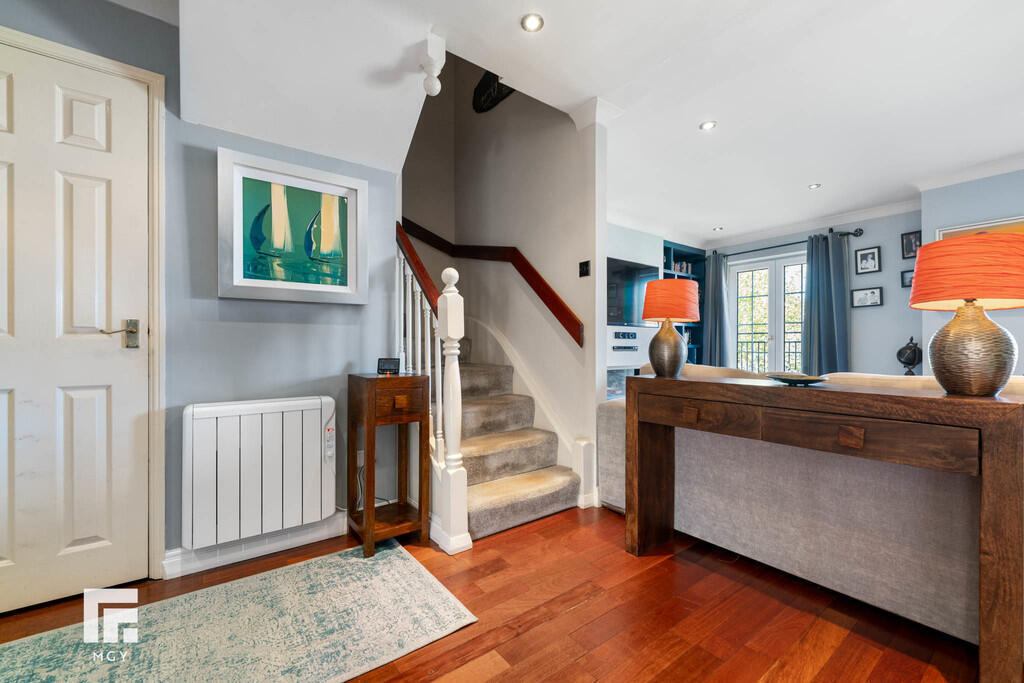 ENTRANCEHALL Entered via front door leading from communal hallway. Wood flooring. Spotlights. Door to lounge/diner. Stairs rising to first floor.