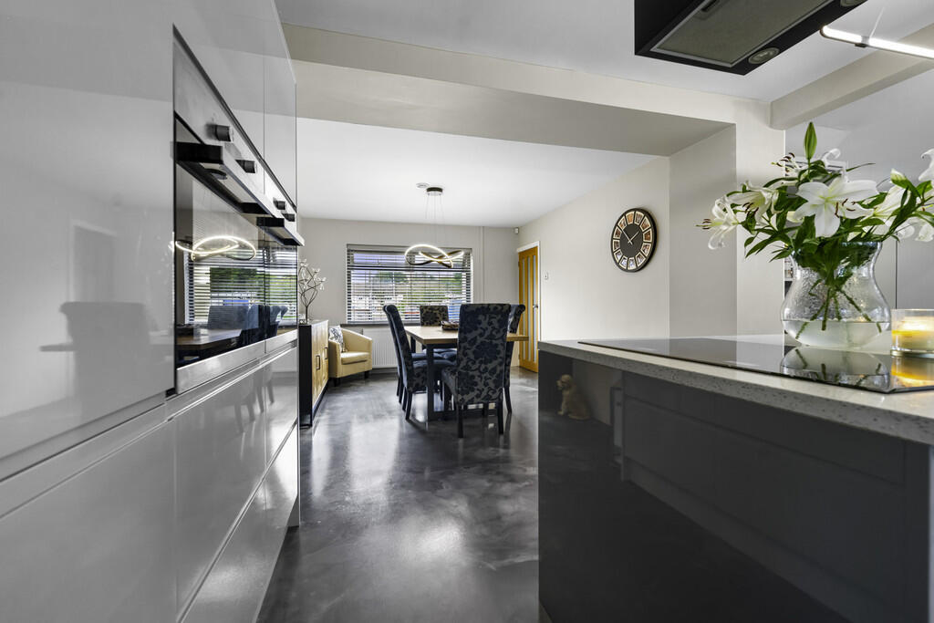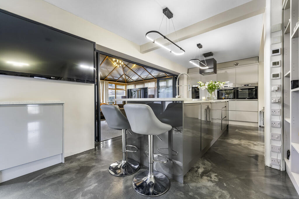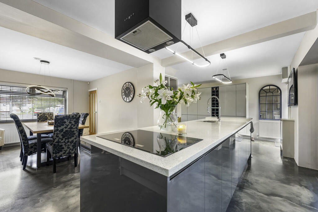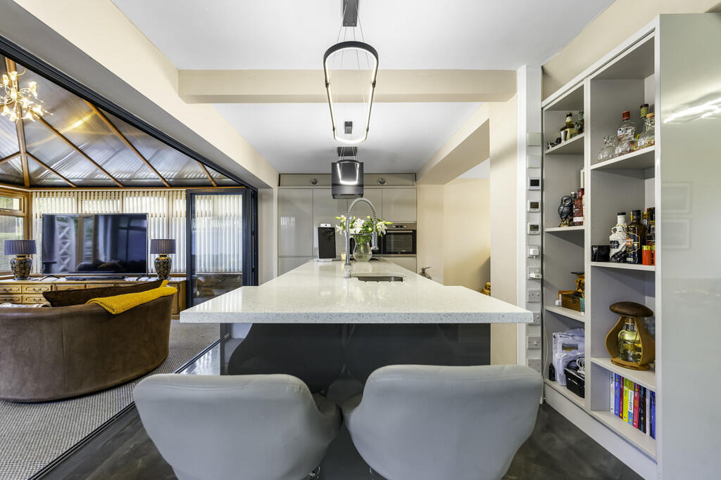 KITCHEN21' 10" x 7' 11" (6.66m x 2.42m) A well presented kitchen fitted with a wide range of modern full height units including integrated double electric oven. Feature 3.5m central island with breakfast bar, integrated dishwasher and induction hob with extractor hood over. One and a half bowl stainless steel sink with complementary granite work surfaces. Radiator. Resin flooring. Opening to dining room and bi-fold doors to conservatory. uPVC double glazed door to side patio.