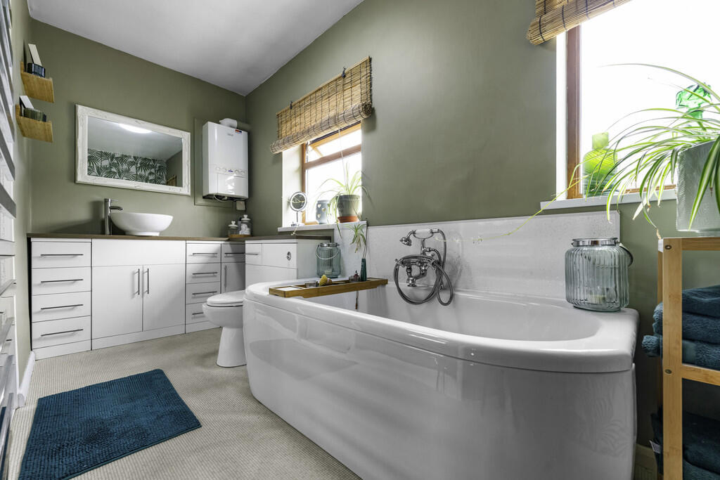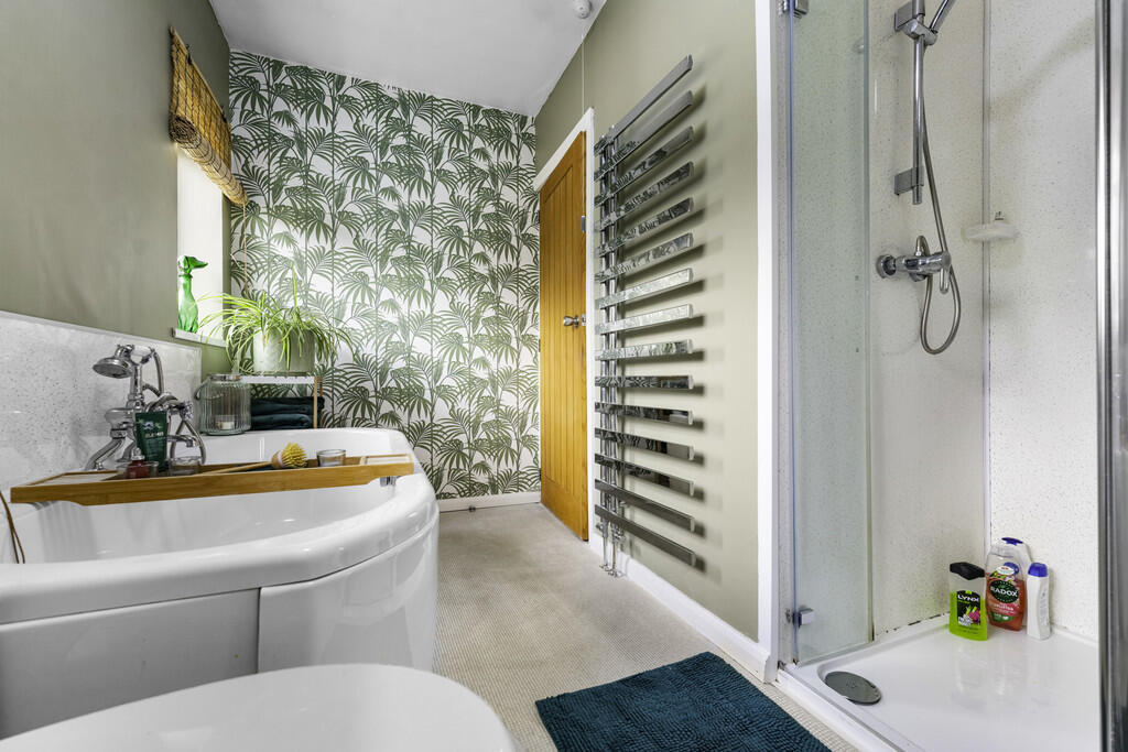 BATHROOM11' 9" x 8' 5" (3.60m x 2.59m) A stylish suite to include low level WC, vanity enclosed wash hand basin, fitted shower cubicle and panelled bath with shower attachment. Towel radiator. Wall mounted gas central heating boiler. Two uPVC double glazed windows to rear.