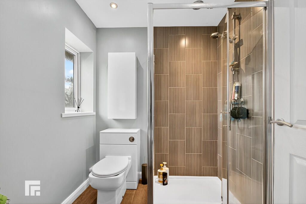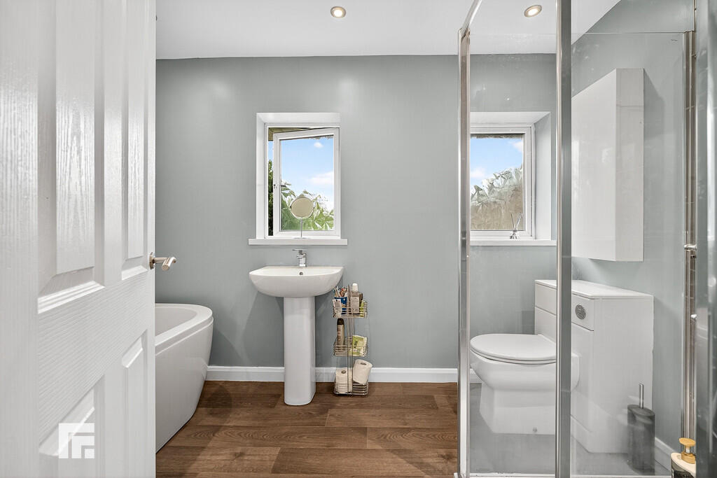 FAMILYBATHROOMANDSHOWERROOM10' 1" x 6' 2" (3.09m x 1.88m) Modern white suite comprising low level wc, wash hand basin, large walk in shower cubicle with folding glass screen door, bath with central taps. Tiled splash back. Two obscured glass windows to rear. Recessed spotlights. Chrome heated towel rail.