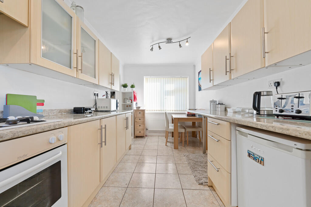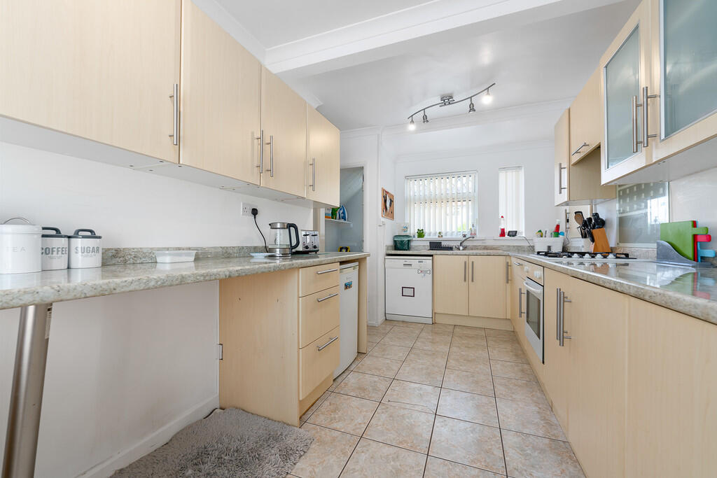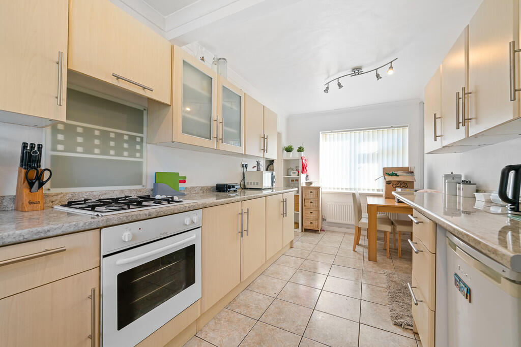 KITCHENANDDINER18' 2" x 9' 10"(max) (5.55m x 3.01m) Well appointed along three sides in light wood grain effect panel fronts beneath round nosed worktop surfaces, inset 1.5 bowl sink with side drainer, inset four ring gas hob with oven below, concealed cooker hood above, plumbing for dishwasher, space for fridge, understairs recess with plumbing for washing machine, worktop breakfast bar area, matching range of eye level wall cupboards, ample space for dining table, windows to front and rear, radiator and door to utility room.