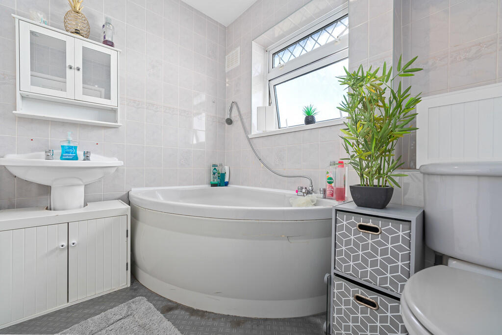 FAMILYBATHROOM7' 6" x 5' 9" (2.29m x 1.76m) Comprising low level W.C, wash hand basin, corner bath with shower mixer tap, full wall tiling and radiator.