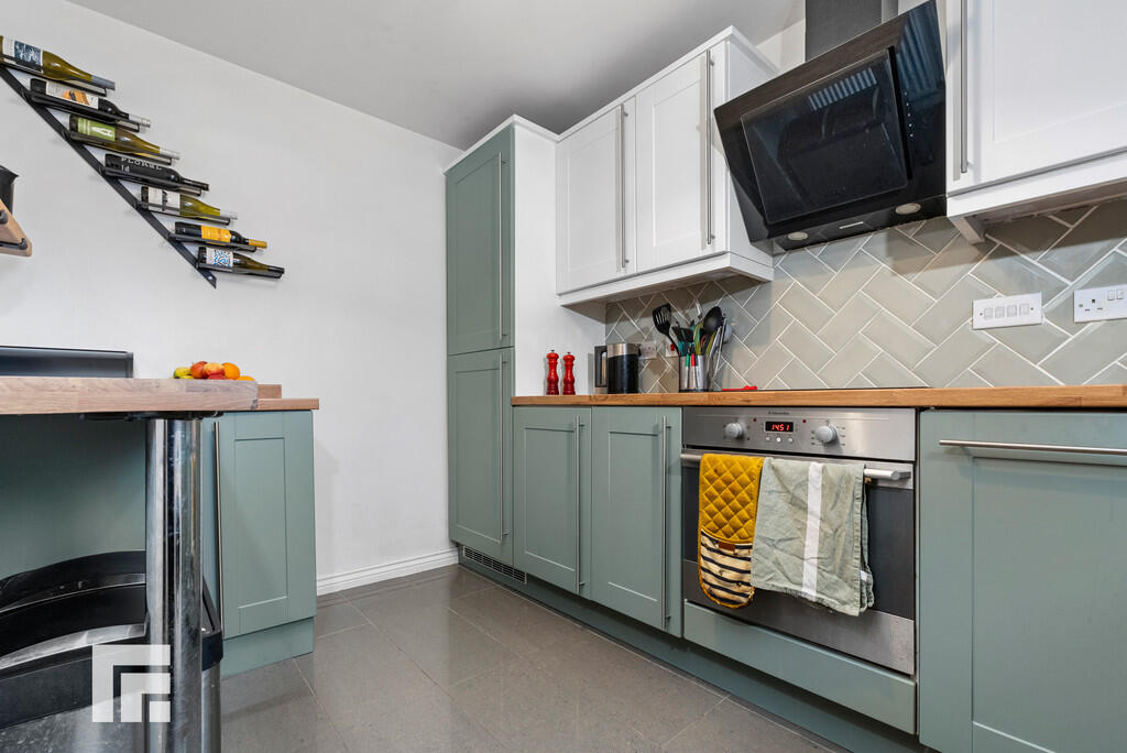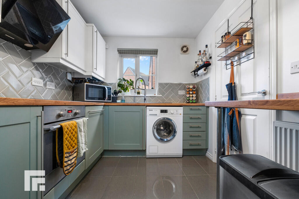 KITCHEN11' 1" x 7' 6" (3.40m x 2.31m) Modern kitchen well appointed along four sides in panelled fronts with chrome bar handles beneath woodgrain finish laminate worktop surfaces. Inset sink with side drainer. Inset four ring induction hob with oven below and cooker hood above. Integrated fridge freezer. Integrated dishwasher. Plumbing for washing machine. Matching range of eye level wall cupboards. Concealed 'Viessmann' gas central heating boiler (fitted 2024). Tiling splash back. Tiled flooring. Window to front. Radiator.