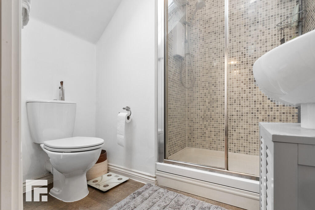 ENSUITESHOWERROOM White suite comprising low level wc, wash hand basin, large shower cubicle with 'Mira' shower above. Mosaic style tiling to splash back areas. Extractor fan. Window to rear pitch. Radiator.