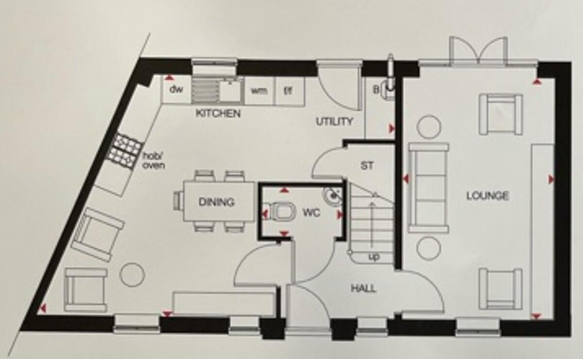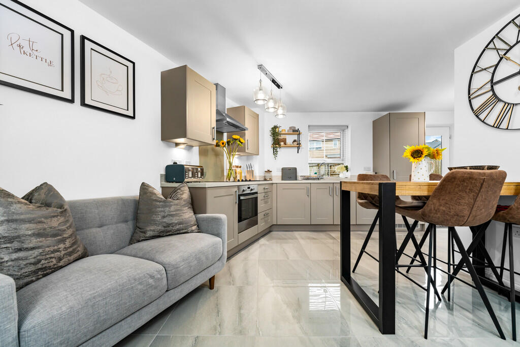 KITCHENANDDININGROOM16' 9" x 15' 7"(max) (5.13m x 4.77m) Kitchen well appointed along three sides in matte finish panelled fronts beneath square edge worktop surfaces, inset stainless steel sink with side drainer, inset four ring hob with oven below, extractor hood above. Integrated dishwasher, integrated fridge freezer, integrated washer dryer. Matching range of eye level wall cupboards with under counter lights, large under stairs storage cupboard, concealed ideal logic gas central heating boiler. Ample space for family dining and seating area. Two windows to front, one to rear and door to garden. Quality ceramic tiled flooring throughout. Two radiators.