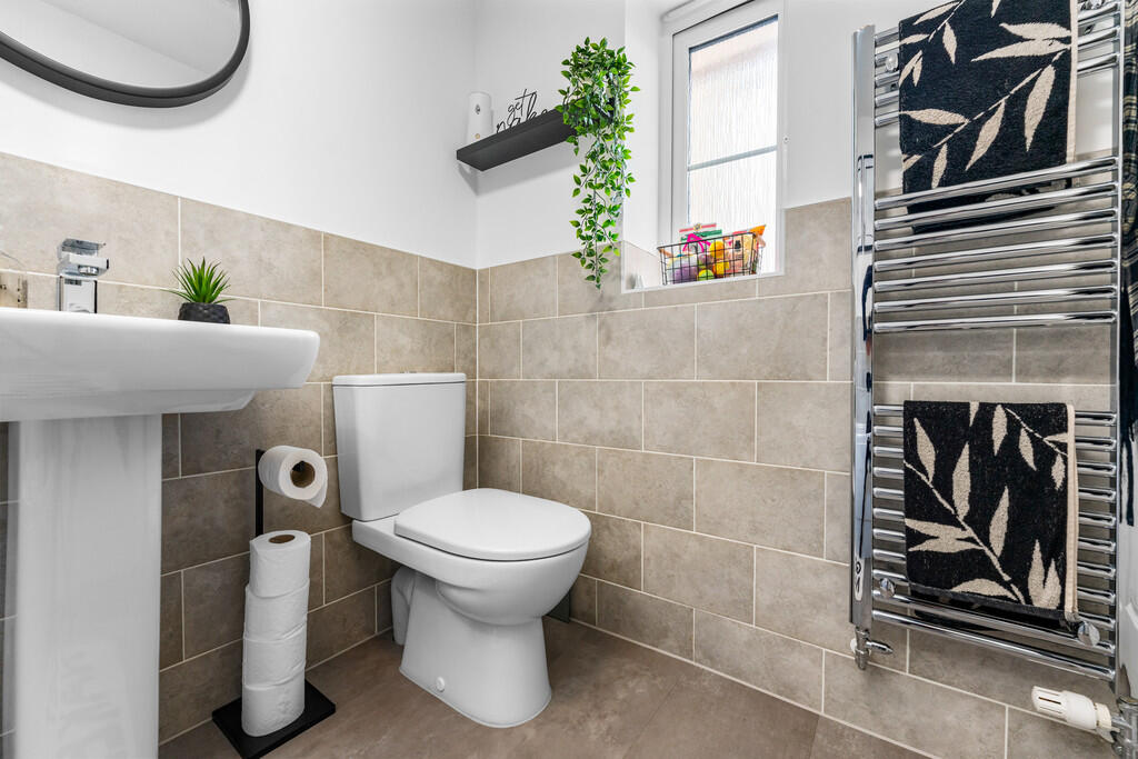 CLOAKROOM Quality white suite comprising low level wc, wash hand basin, wall tiling to half height, extractor fan and radiator.
