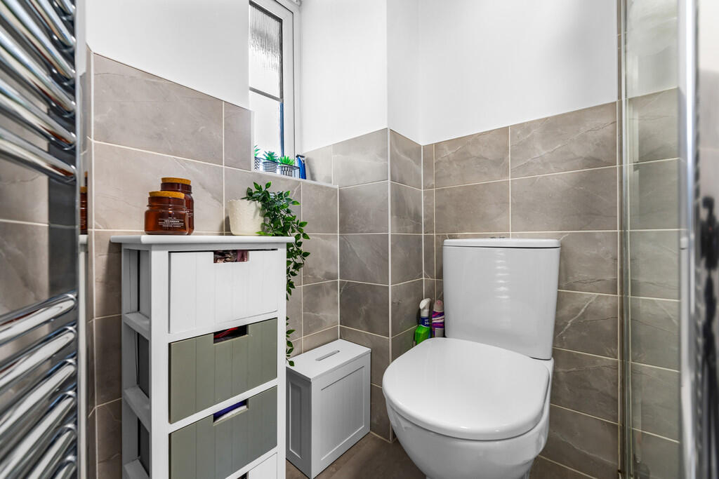 ENSUITESHOWERROOM Modern white suite comprising low level wc, wash hand basin, double width shower cubicle with 'Mira' shower above, wall tiling to splashback areas and along half height. Electric shaver point. Extractor fan. Obscure glass window to rear. Chrome heated towel rail.