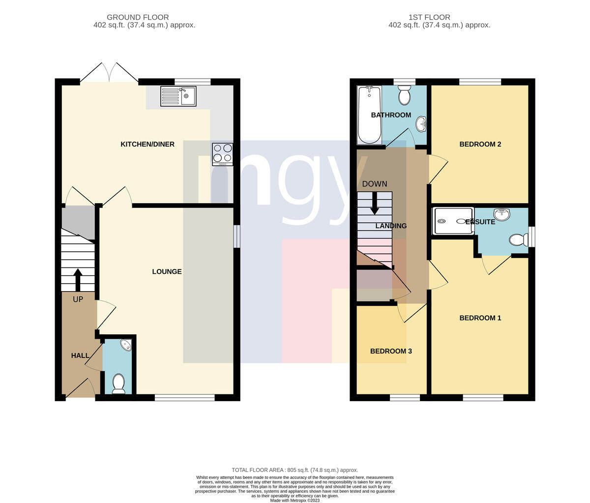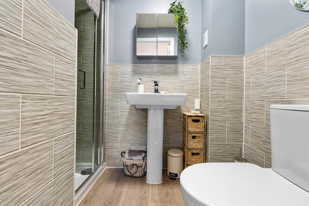 ENSUITESHOWERROOM Quality white suite comprising low level wc, wash hand basin, large shower cubicle with 'Aqualisa' shower, extractor fan, wall tiling to splash back areas and radiator.
