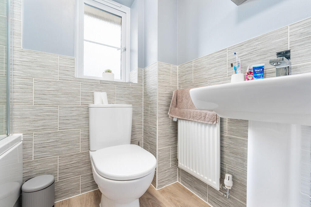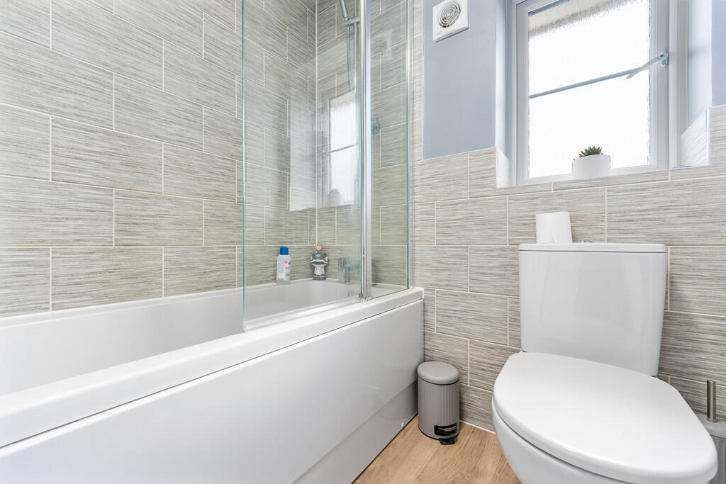 FAMILYROOM6' 2" x 5' 6" (1.90m x 1.68m) Modern white suite comprising low level wc, wash hand basin, panelled bath with chrome shower above, swivel shower screen, wall tiling to splash back areas, radiator and obscure glass window to rear.