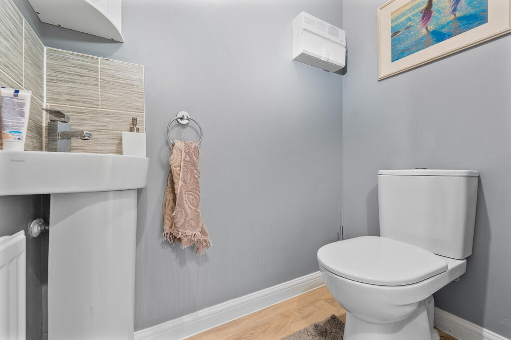 CLOAKROOM Modern white suite comprising low level wc, corner wash hand basin, extractor fan and radiator.