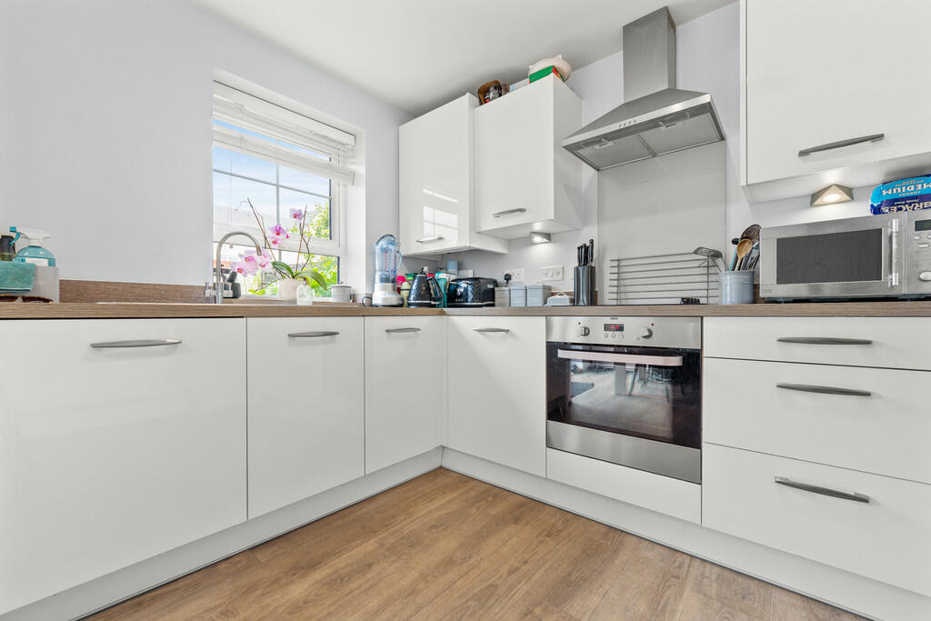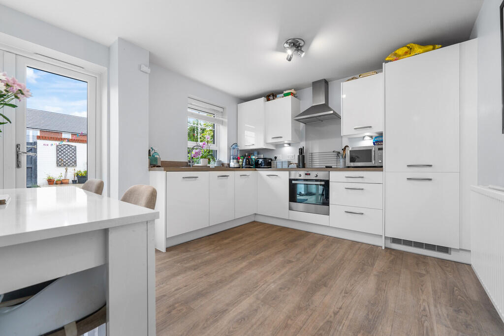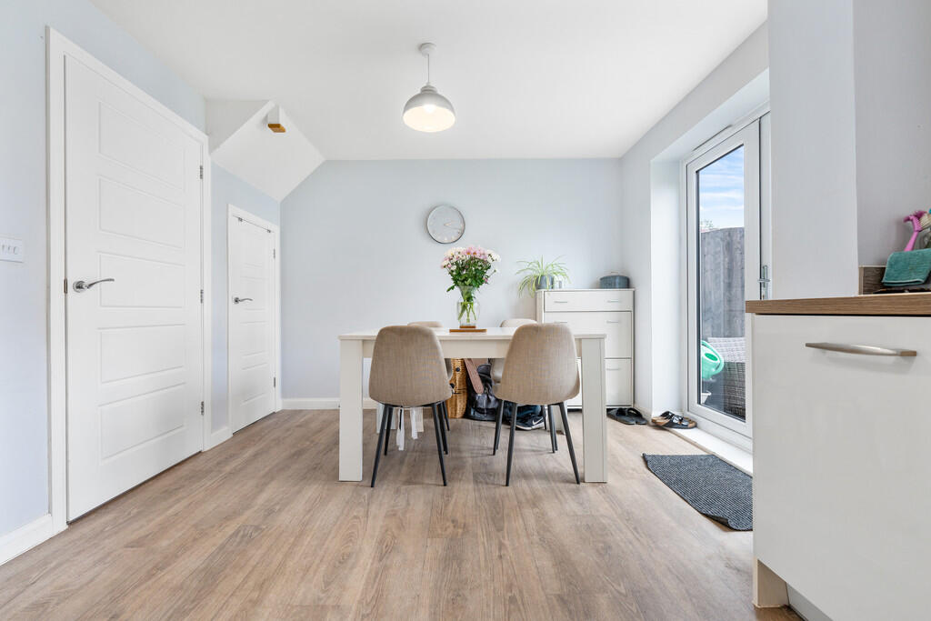 KITCHENANDDINER14' 11" x 10' 4" (4.56m x 3.16m) Kitchen appointed along two sides in light high gloss finish fronts beneath square edge worktop surfaces, inset stainless steel sink with side drainer, inset four ring electric hob with cooker hood above and oven below, integrated fridge/freezer, integrated washer/dryer, integrated slim line dishwasher, concealed Ideal logic combi gas central heating boiler, glass splashback behind hob, window to rear, double opening french doors to rear patio, understairs storage cupboard, radiator and ample space for family dining table.
