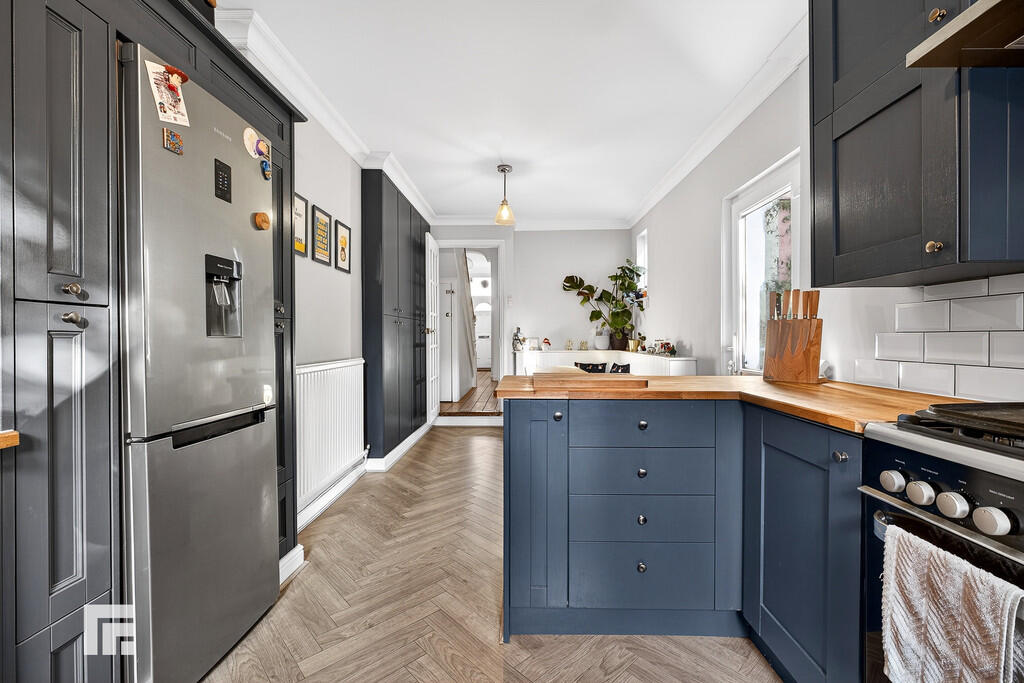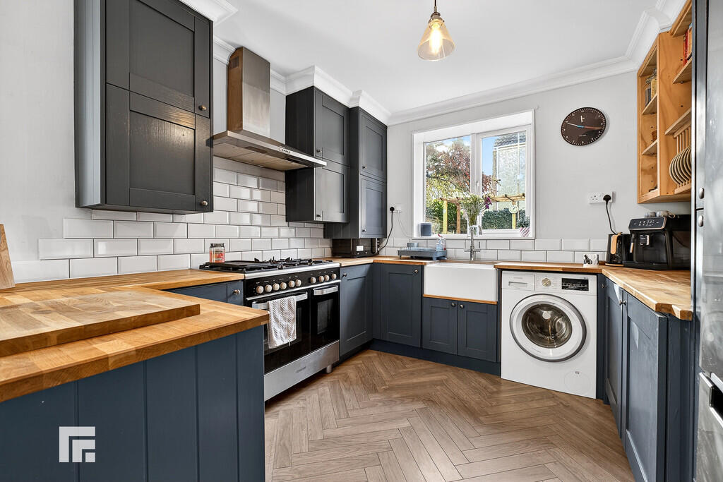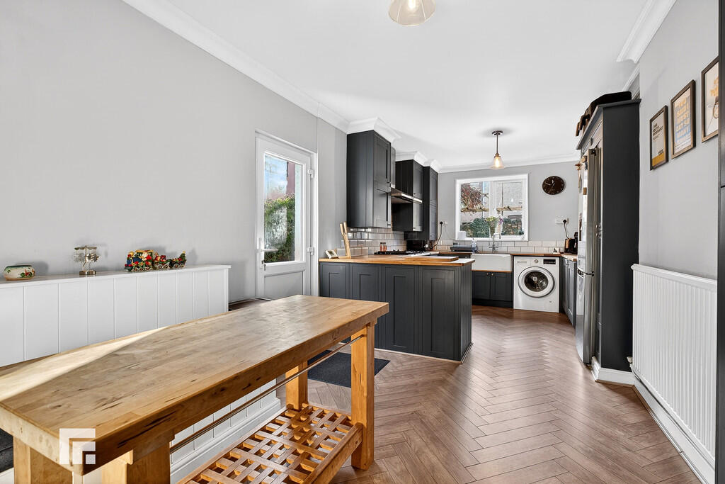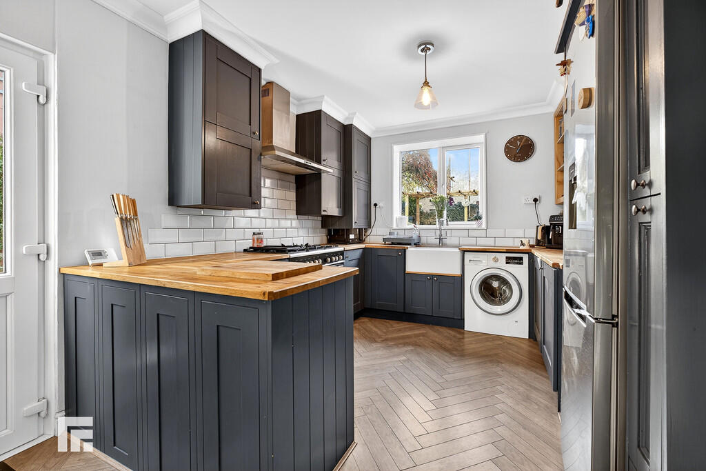KITCHEN/BREAKFASTROOM21' 1" x 9' 8" (6.45m x 2.95m) Herringbone style flooring. Pendant light fittings. Radiator. Power points. Double glazed uPVC windows to side and rear aspect. Fitted kitchen with a range of wall, base and drawer units with worktops over incorporating inset Belfast sink with mixer tap over. Space for washing machine, fridge/freezer and range cooker with extractor above. Tiled splashback. Door leading to rear garden.