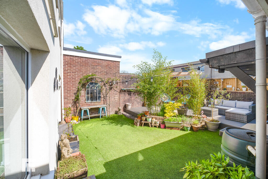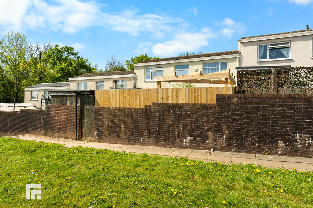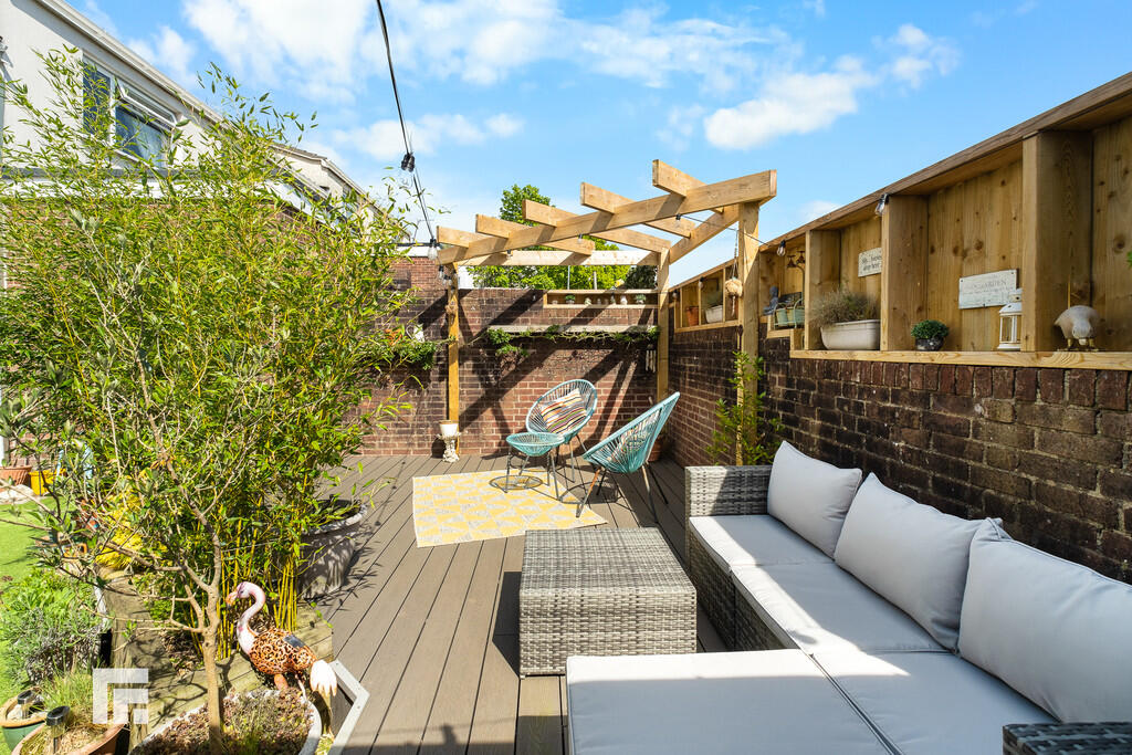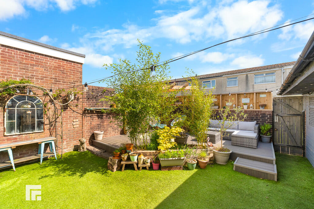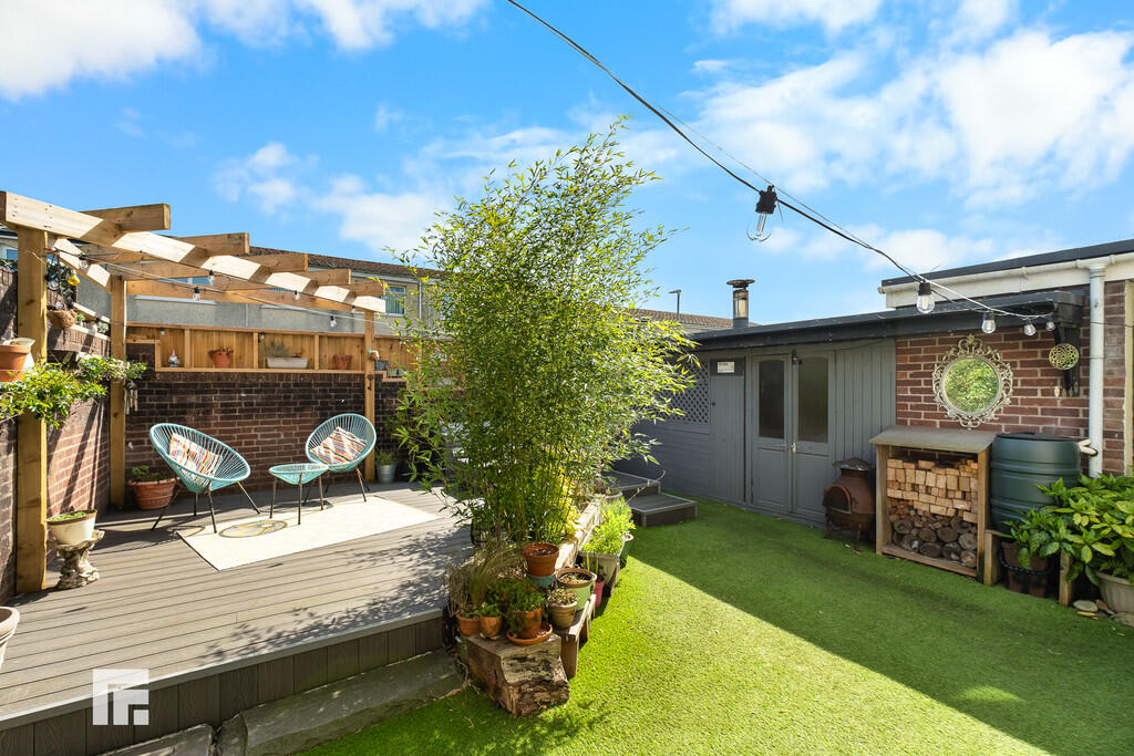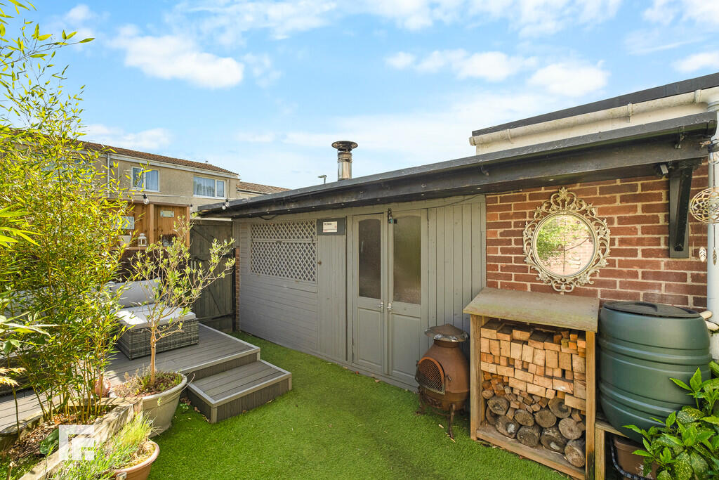 Rear- Brick built storage/ snug with power and lighting. Raised composite decking. Access to rear via wooden gate. Raised flower deck. Wooden pergola. Wooden shelving. Two storage sheds, one housing gas meter.