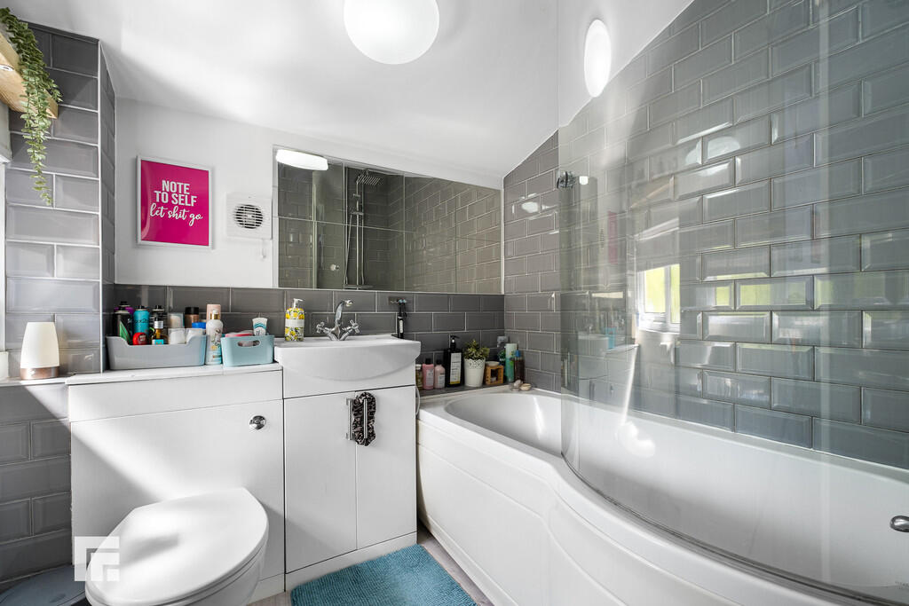 BATHROOM uPVC obscured double glazed window to side. Part tiled walls. Vanity unit with inset wash hand basin, low level w.c, panelled bath with rainflow shower over. Wall mounted mirror. Extractor fan. Vinyl flooring.