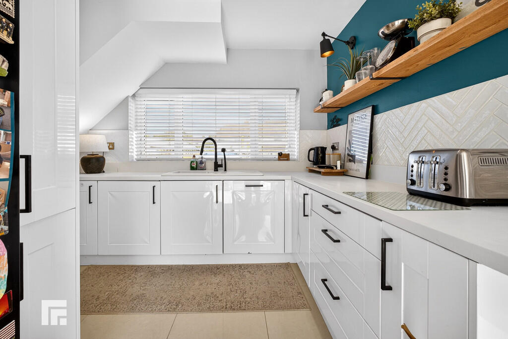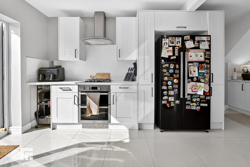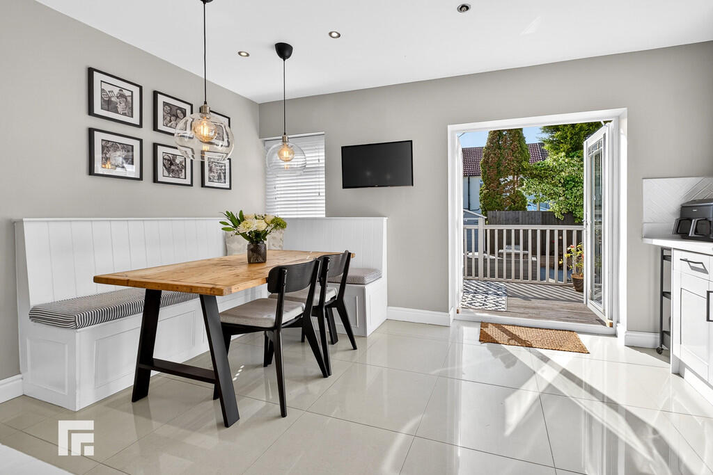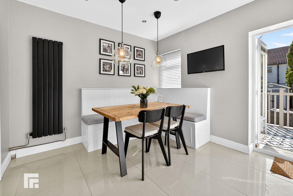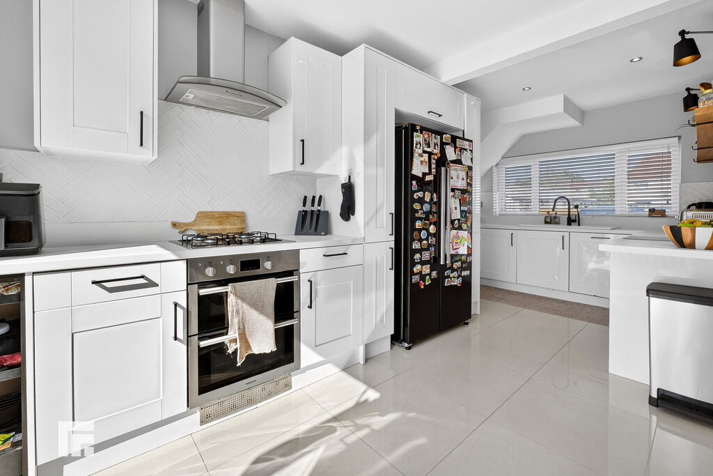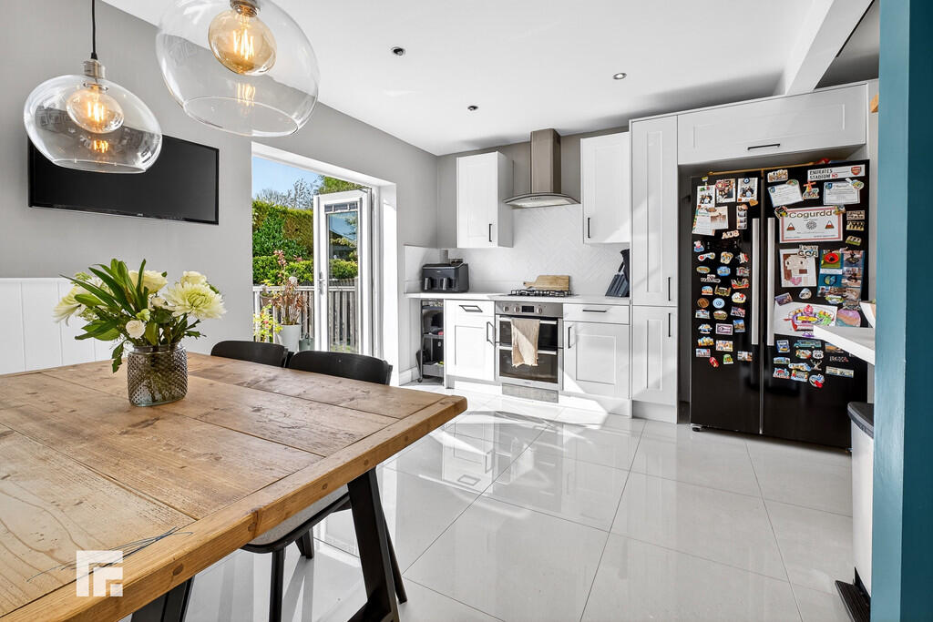 KITCHENANDDININGROOM18' 2" x 14' 1" (5.54m x 4.30m) Well appointed along three sides in light panelled fronts beneath laminate worktop surfaces. Inset 1.5 bowl ceramic sink with side drainer. Inset four ring gas hob with curved glass cooker hood above and oven below. Integrated dishwasher. Space for American fridge freezer. Matching range of eye level wall cupboards. Tiled splash back. Window to front. Ceramics tiled flooring. Ample space for large dining table with fitted corner seats with storage below. French doors to the rear garden and window to rear. Vertical radiator. Folding door to utility room.