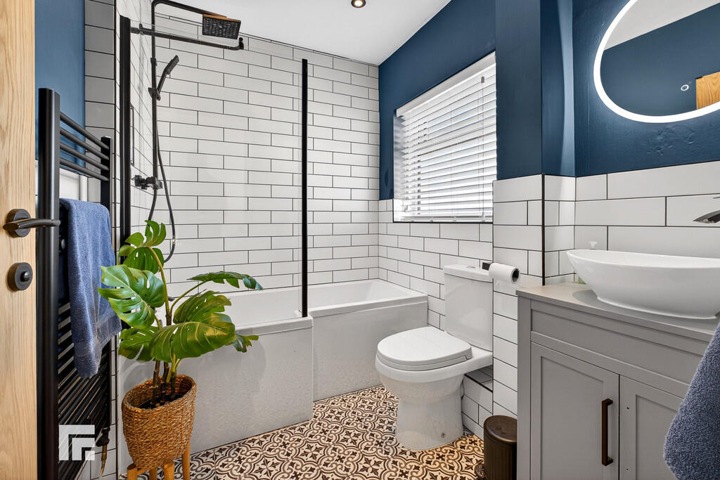 FAMILYBATHROOM7' 7" x 5' 10" (2.33m x 1.79m) Quality white suite comprising low level wc, vanity wash basin with storage below, p-shaped bath with matte black twin head shower above and matching swivel glass screen. Wall tiling to splash back areas. Obscured glass window to front. Recessed spotlights. Heated towel rail.