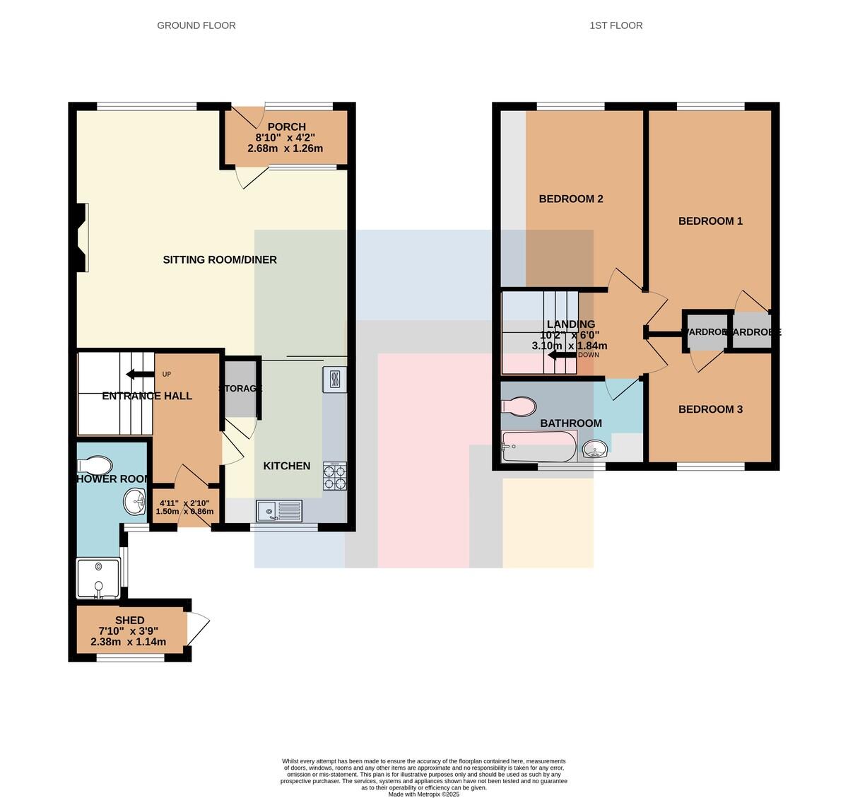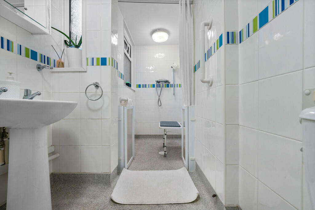 CLOAKROOM/WETROOM Upvc obscure glazed window to front. Tiled walls. Low level wc and pedestal wash hand basin. Wall mounted bathroom cabinet. Radiator.