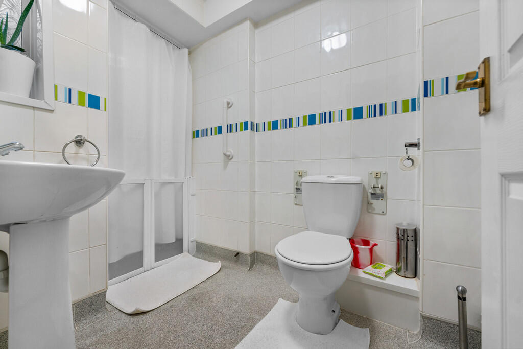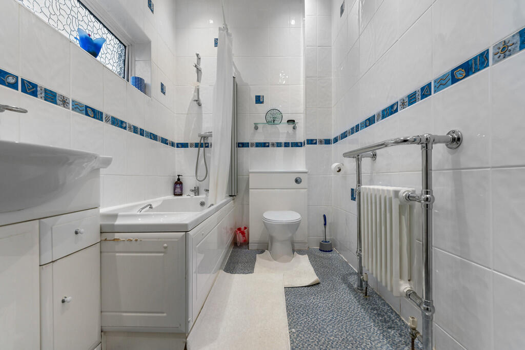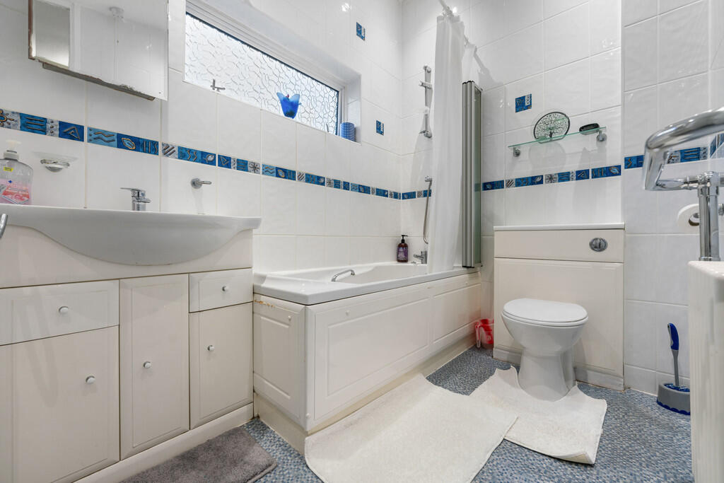 BATHROOM Double obscure window to rear. Down lighters to ceiling. Fully tiled walls. Three piece suite comprising wc with concealed tank, panelled bath with shower and shower screen and vanity unit with cupboards below and inset wash hand basin. Built in cupboard housing combi gas boiler.