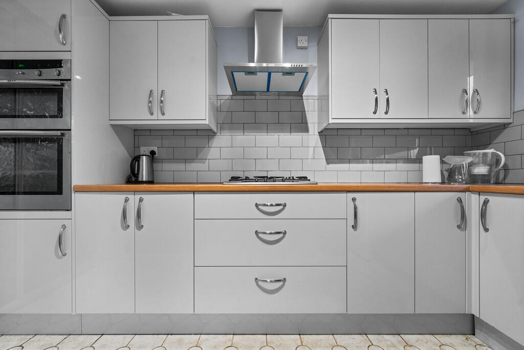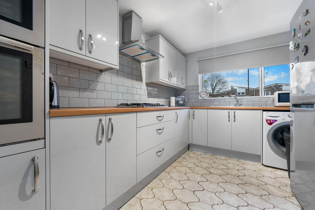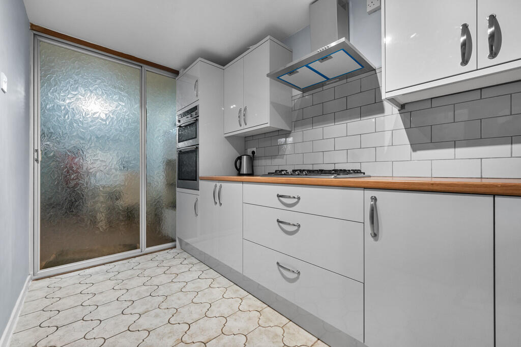 KITCHEN12' 0" x 8' 7" (3.68m x 2.62m) Upvc double glazed window to front. Newly fitted kitchen with base and wall units with worksurface and tiled splashbacks incorporating stainless steel sink unit with mixer tap. Built in NEFF double oven with extractor fan over and four ring gas hob. Room for fridge freezer and plumbing for washing machine. Vinyl flooring. Built in storage cupboard with shelving. Sliding glazed door to :-
