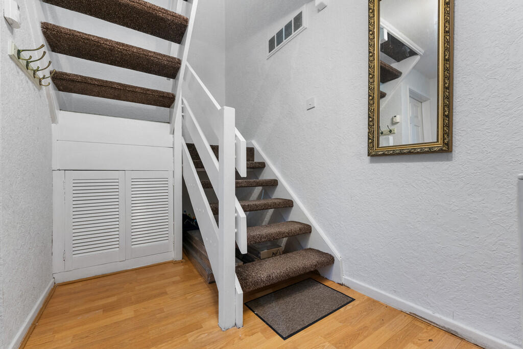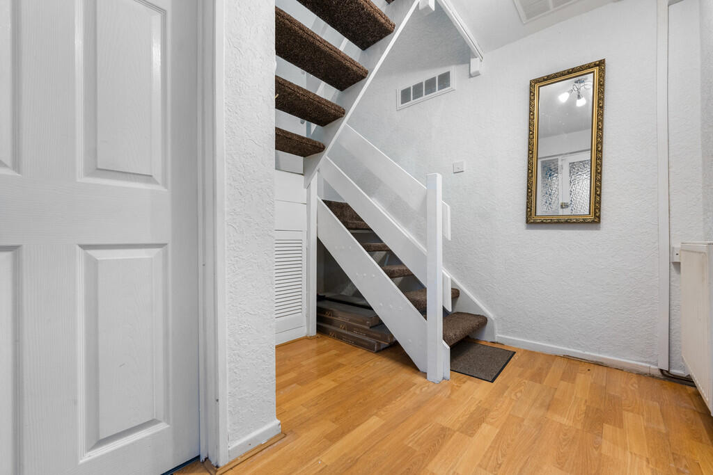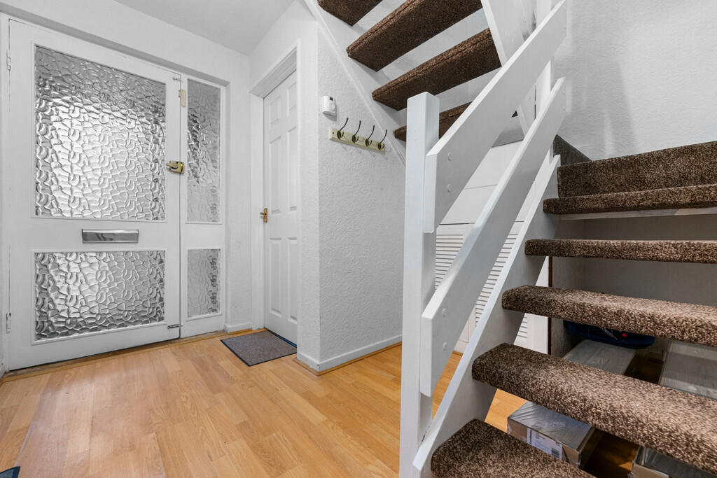 ENTRANCEHALL Entered via wooden door with obscure glazed panels and further obscure glazed panel to side. Laminate flooring. Understairs storage cupboard. radiator. Stairs rising to first floor.