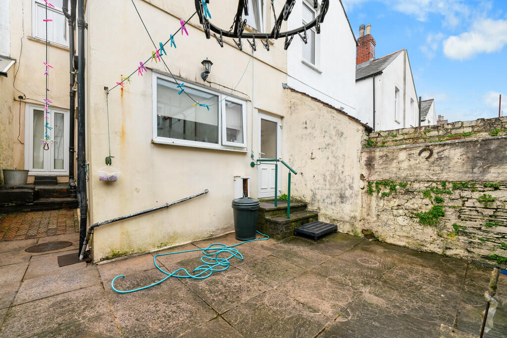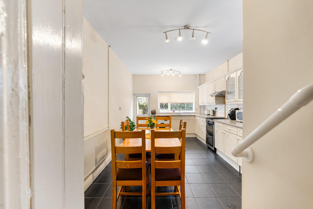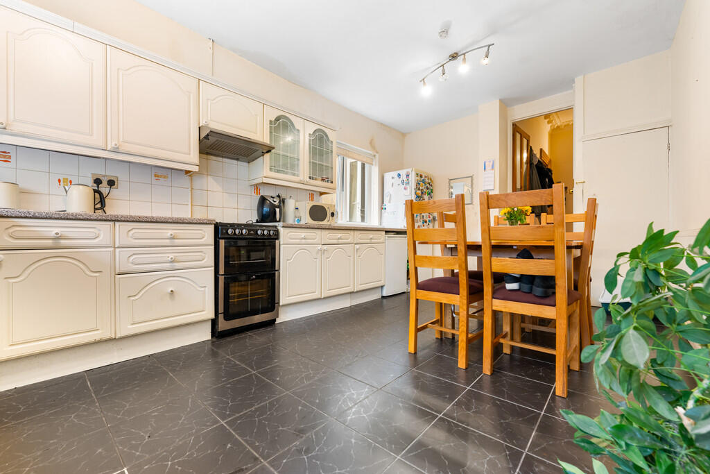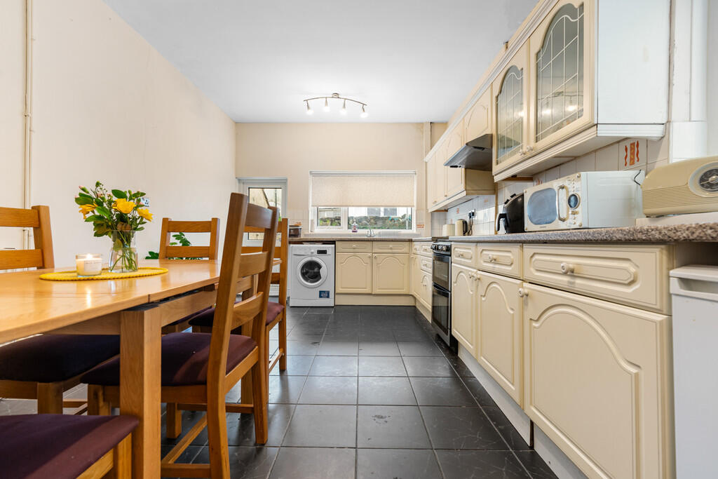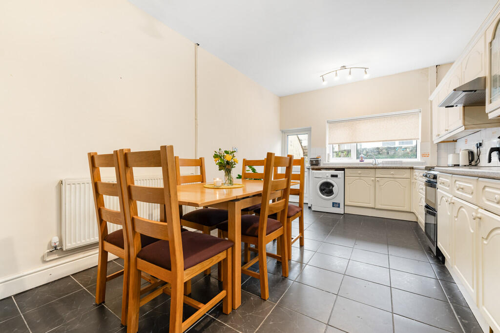 KITCHEN17' 6" x 10' 9" (5.34m x 3.30m) Double glazed uPVC windows to side and rear. uPVC door leading to private rear garden. Tiled flooring. Fitted wall and base units across two walls, with laminate work surfaces incorporating stainless steel sink. Ample storage. Integrated oven with tiled splashbacks and extractor hood over. Space for fridge freezer and dishwasher. Pendant light to ceiling. Stairs leading to cellar. Wall mounted radiator.