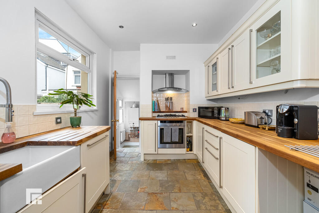 KITCHEN11' 7" x 8' 9" (3.54m x 2.69m) Double glazed uPVC window to side. Tiled flooring and part tiled walls. Fitted wall and base units across three walls, with rounded wooden work surfaces incorporating Belfast sink with mixer tap over. Ample storage. Integrated oven with tiled splashbacks, Neff five ring gas hob and extractor hood over. Integrated dishwasher. Spotlights. Wall mounted radiator. Door to storage cupboard.