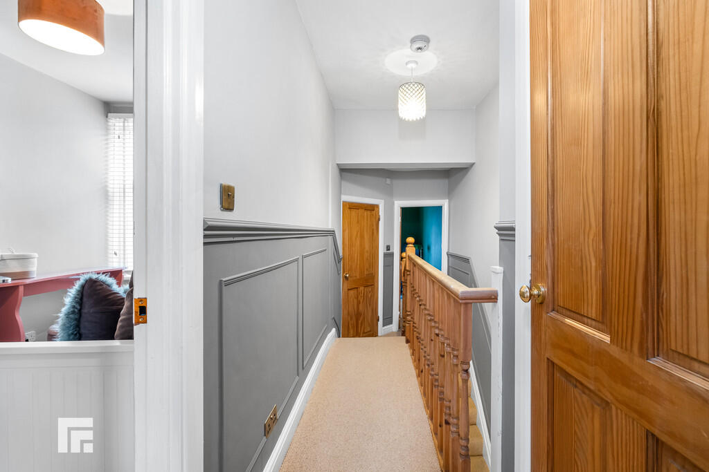 FIRSTFLOORLANDING Split level landing with carpeted flooring. Storage cupboard. Pendant light to ceiling. Wall mounted radiator. Part panelled walls with dado rail. Access to loft hatch. Doors leading to bedrooms and bathroom.