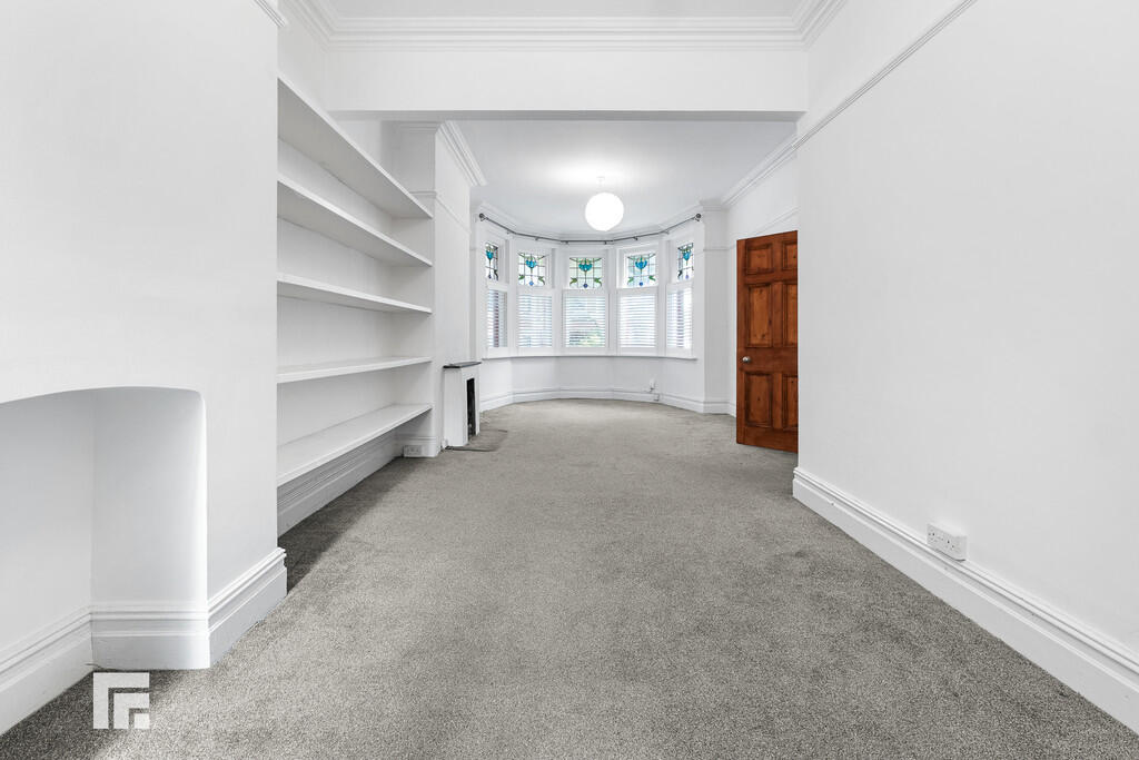LOUNGE11' 9" x 29' 10" (3.60m x 9.11m) Bay windows to front aspect with fitted shutter blinds. Coving and picture rail. Carpeted flooring. Feature fireplace. Alcoves with fixed shelving. Power points. TV and telephone point. Two radiators. Door to access rear garden.