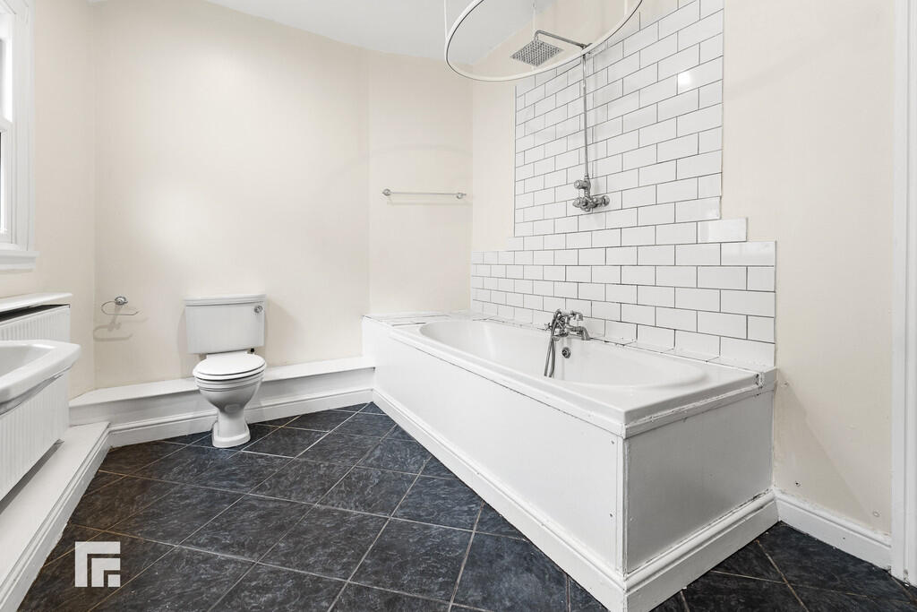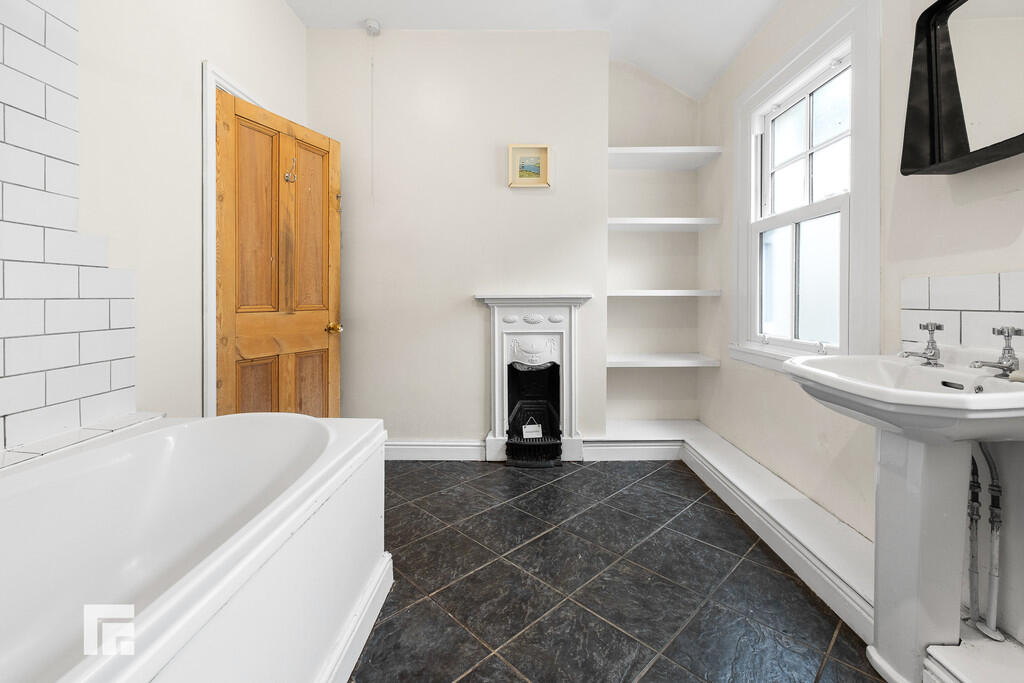 BATHROOM8' 2" x 11' 7" (2.51m x 3.54m) Two obscure double glazed uPVC sash windows to side aspect. Bath with rainfall mains shower over and mixer tap. Pedestal wash hand basin with hot and cold tap over. WC. Tiled flooring. Partially tiled walls. Radiator/ Spotlights. Extractor fan. Wall mounted vanity mirror. Feature fireplace.