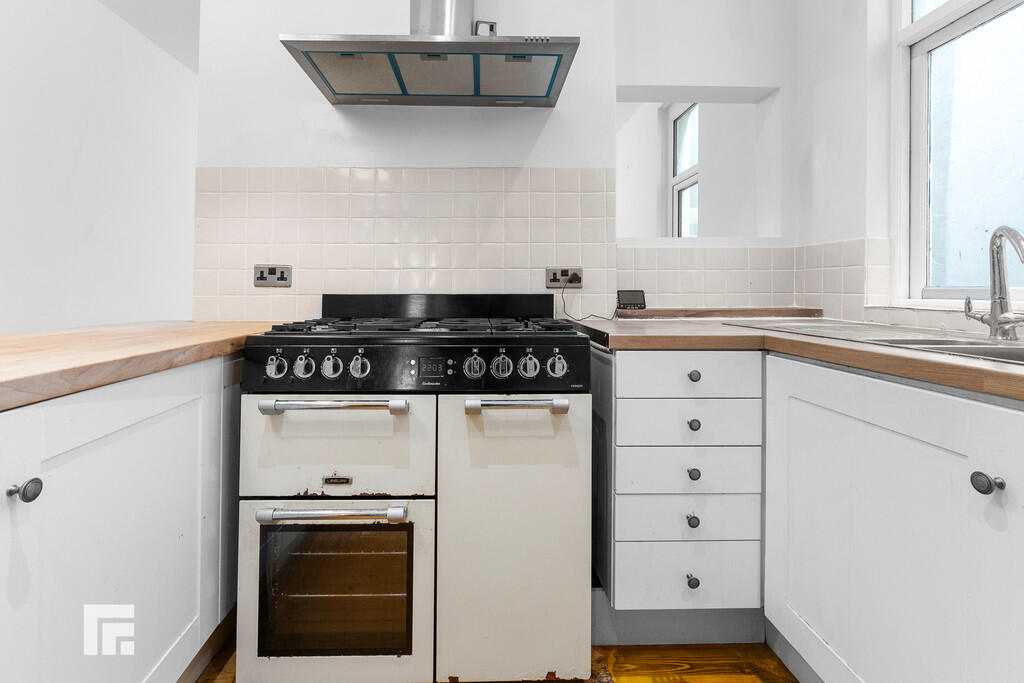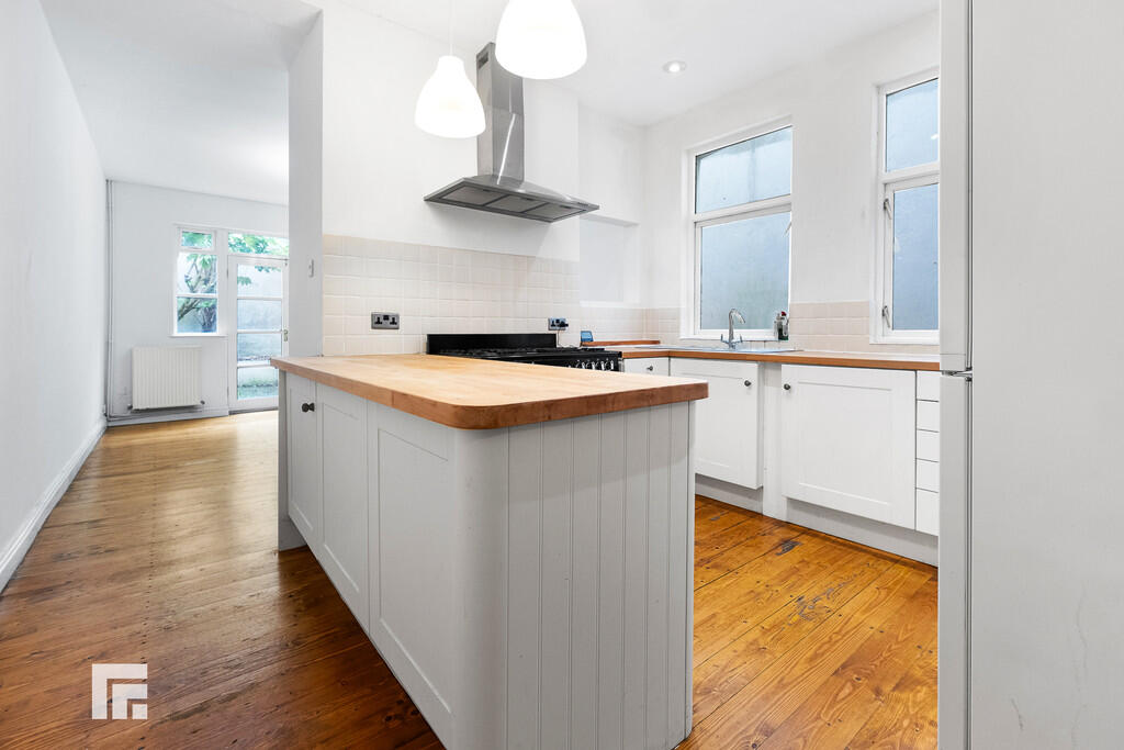 KITCHEN11' 6" x 9' 10" (3.52m x 3.01m) Modern fitted kitchen with wall, base and drawer units with wooden worktops over incorporating five ring gas hob with extractor above, oven below and stainless steel 1.5 sink and drainer with mixer tap over. Tiled splashbacks. Space for appliances such as dishwasher and fridge/freezer. Double glazed uPVC windows to side aspect. Wooden flooring. Spotlights and pendant light fitting. Power points.