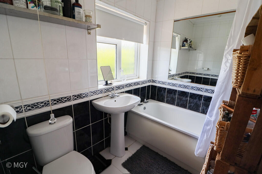 BATHROOM Obscured double glazed uPVC window to rear. Panelled bath with hot and cold taps and with electric shower over, pedestal wash hand basin with mixer tap, w.c. Tiled walls and floor.