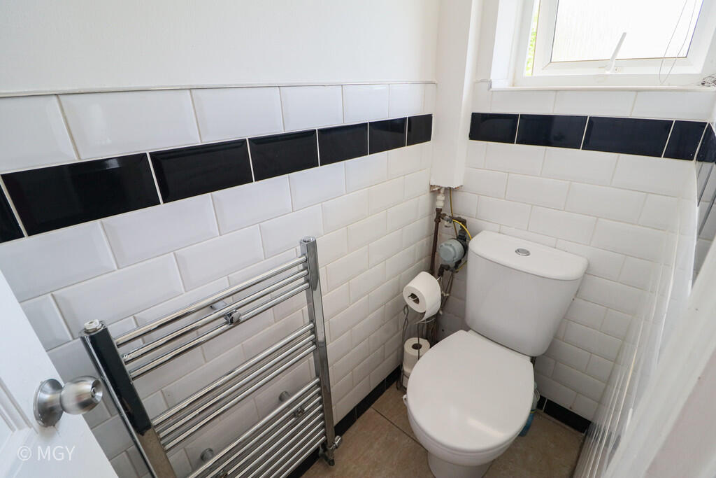 DOWNSTAIRSW.C Obscured double glazed uPVC window to front. Tiled floor. Part tiled walls. Chrome heated towel rail. W.c, wall hung wash hand basin.