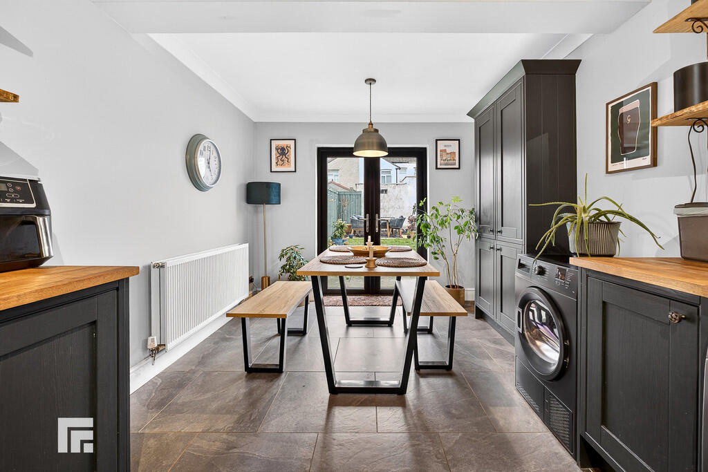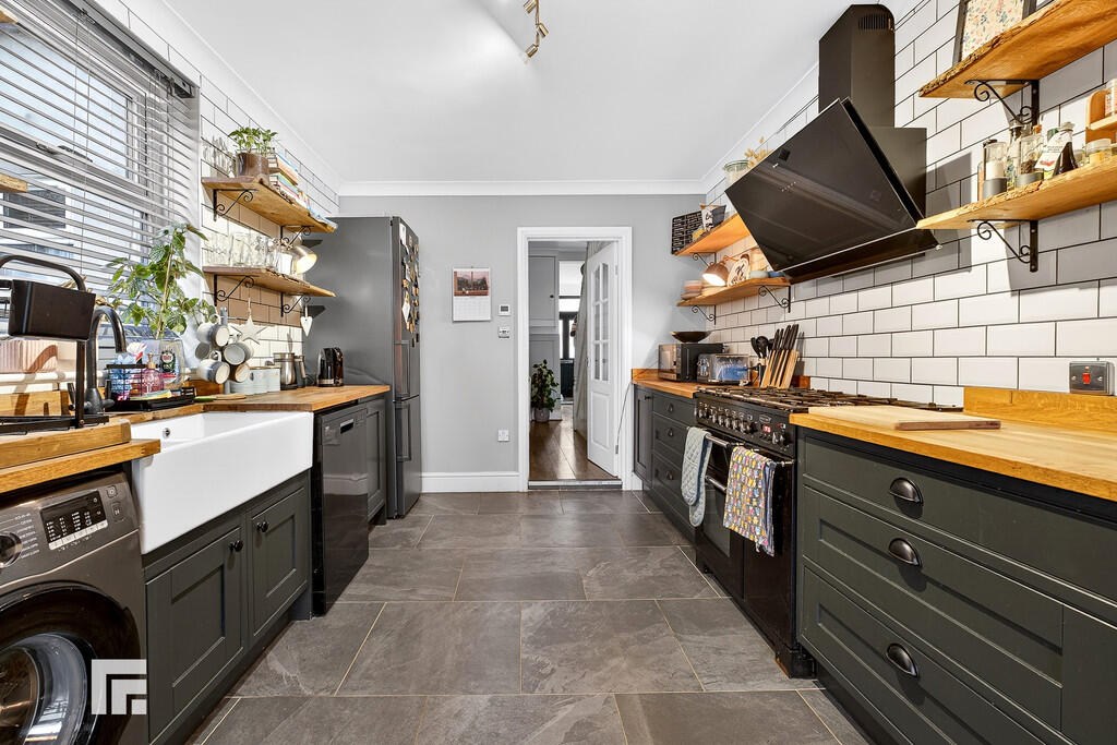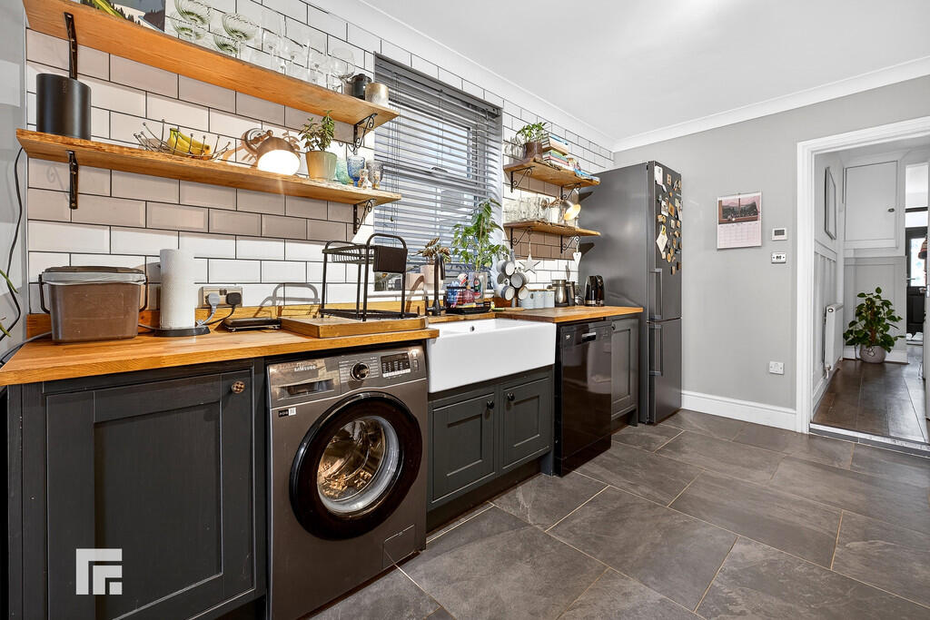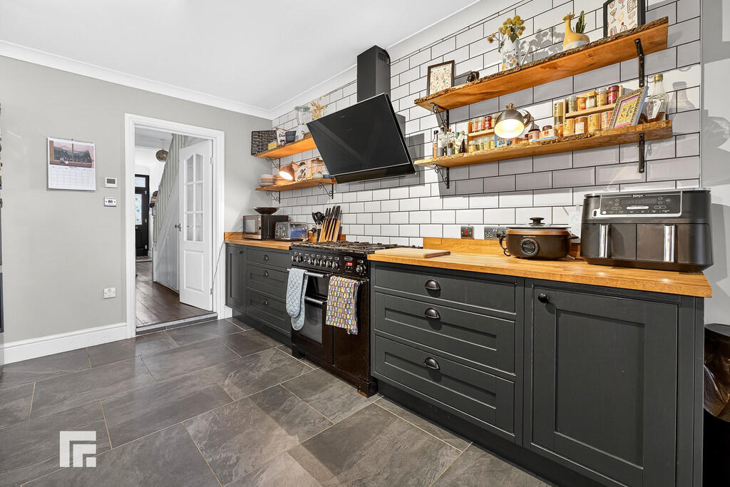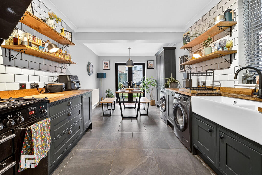 KITCHEN/DINER Range of wall, base and soft close drawer units with oak worktops over incorporating Belfast sink with mixer tap above. Slate tiled flooring with underfloor heating. Partially tiled walls. Five ring gas hob with oven beneath and extractor fan above. Dishwasher. Power points. Double glazed window to side with fitted blinds. Additional built in pantry storage separate from kitchen area. Pendant light fitting. Double glazed French doors leading to rear garden. Space for washing machine and fridge freezer. Radiator.