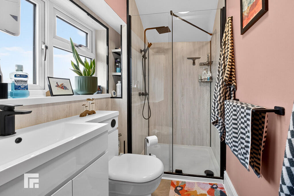 SHOWERROOM Modernised shower room, white three piece suite comprising WC, vanity enclosed wash hand basin with mixer tap over, and shower cubicle with rainfall shower and additional shower attachment. Inset storage. Obscure window to rear. Pendant light fitting.