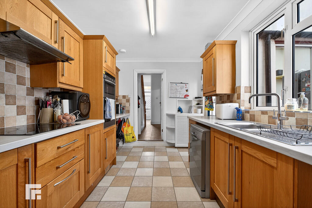 KITCHEN9' 2" x 14' 7" (2.80m x 4.46m) Tiled flooring. Fitted kitchen with a range of wall, base and drawer units with worktops over incorporating stainless steel 1.5 sink with mixer tap over and four ring electric hob with extractor above. Integrated oven. Space and plumbing for washing machine. Strip LED light. Tiled splashback. Power points. Double glazed uPVC window to side aspect. Doors to utility area and downstairs shower room.